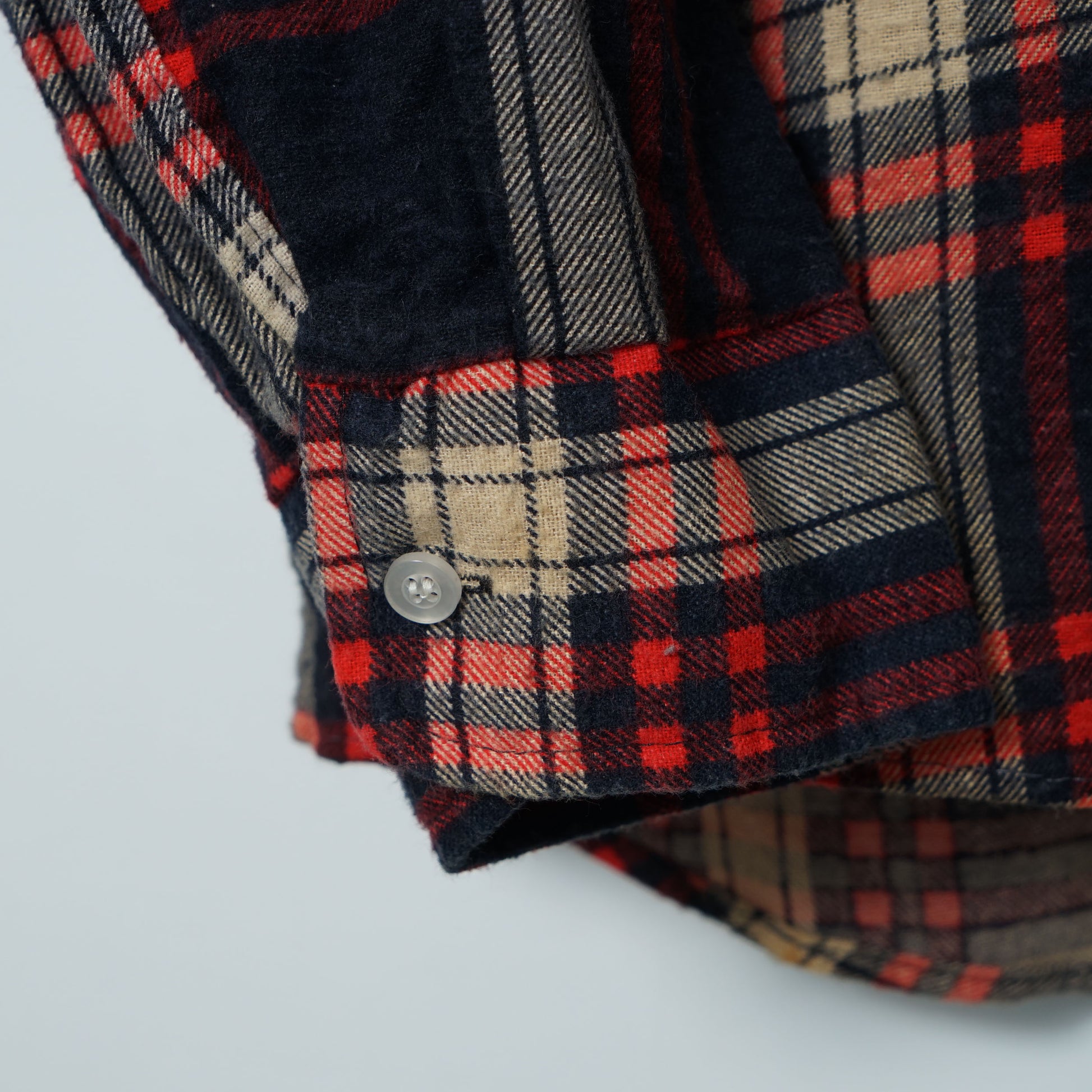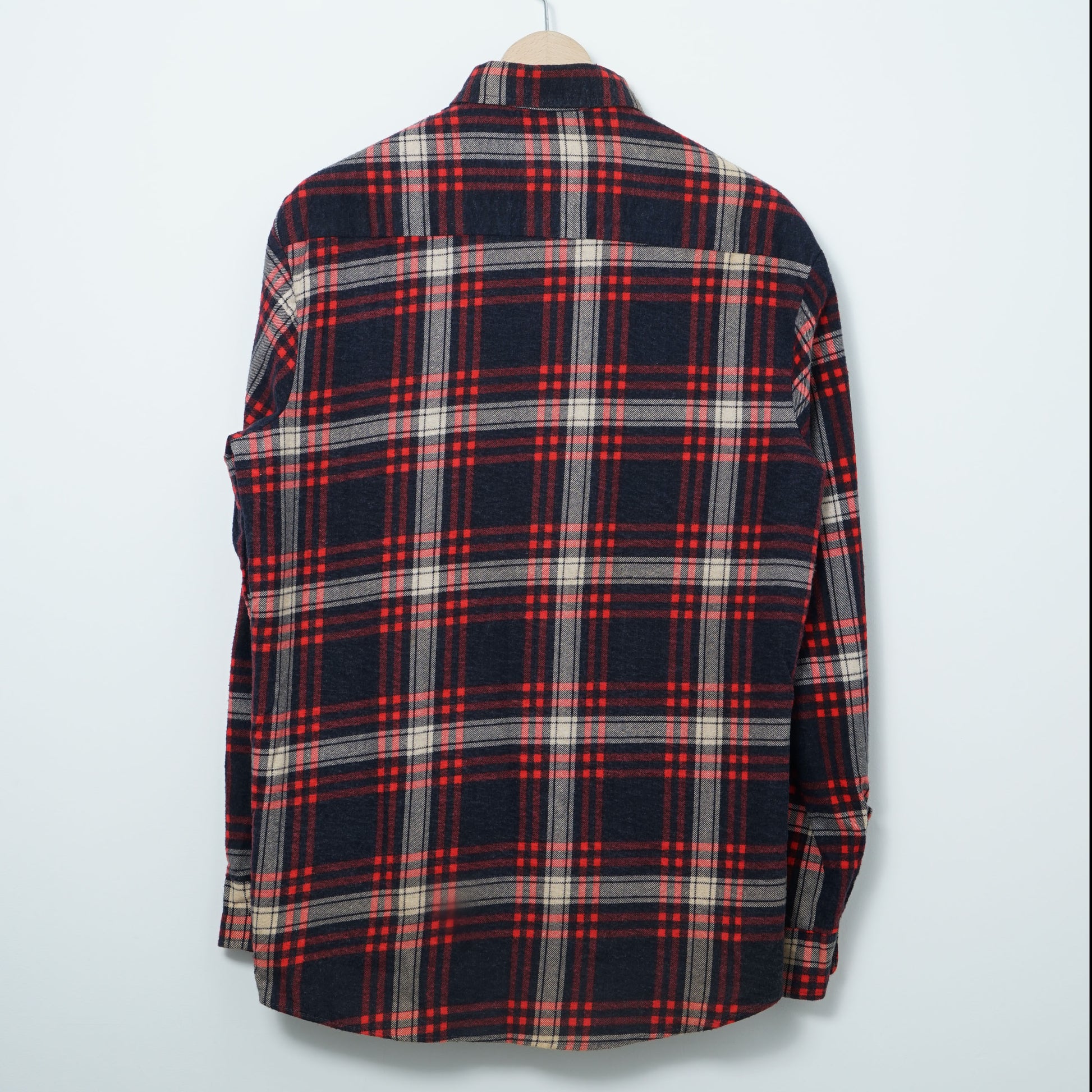 深いネイビーをベースに、レッドのラインが走るタータンチェックのフランネルシャツ。