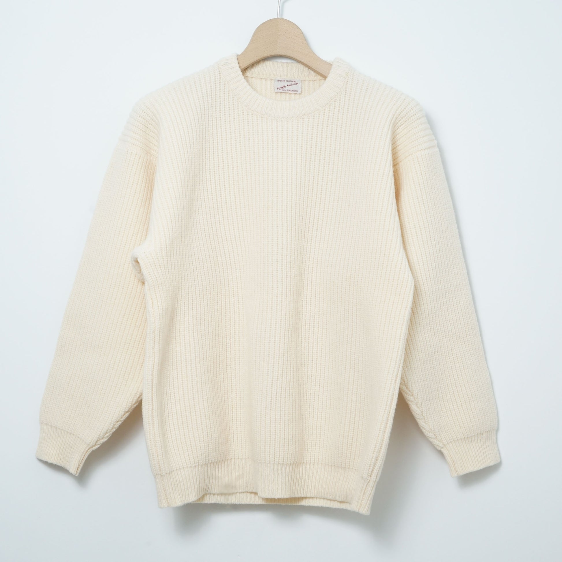 スコットランド製らしい重みと柔らかさを併せ持った、ピュアラムズウールのクルーネックニット。