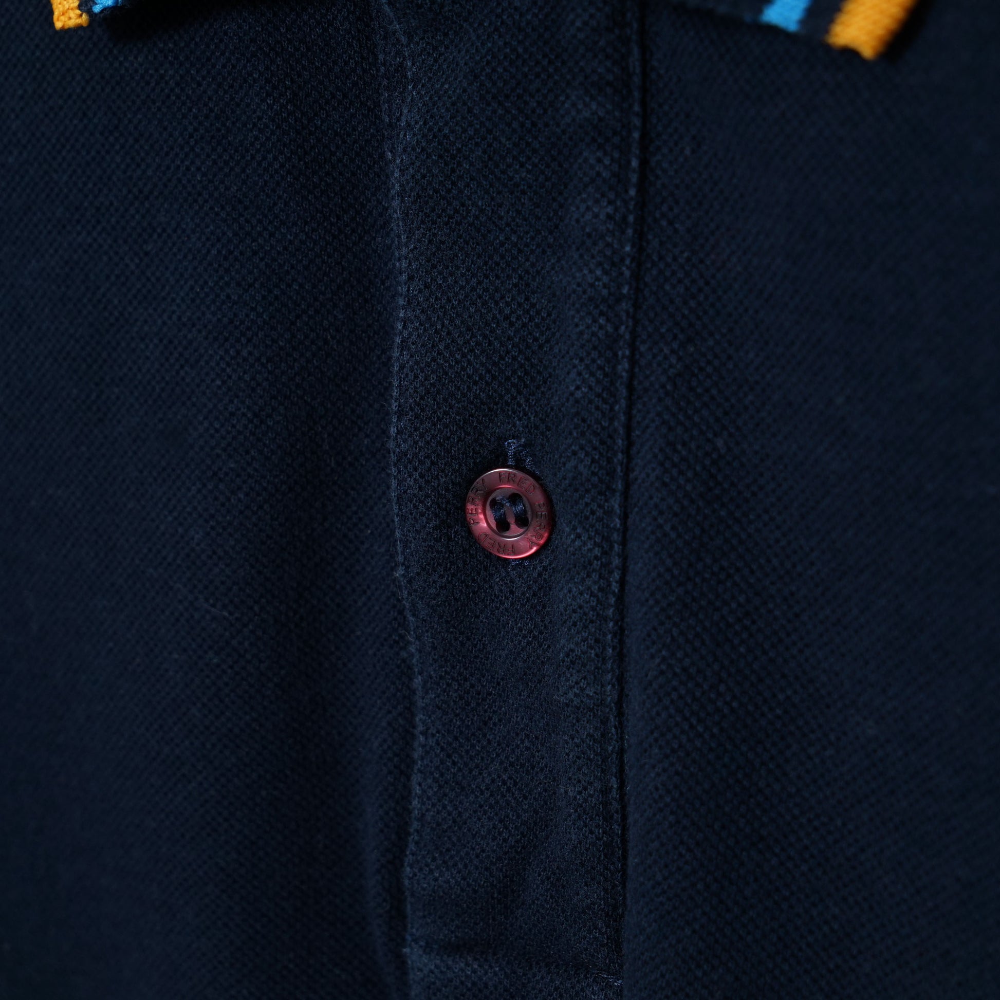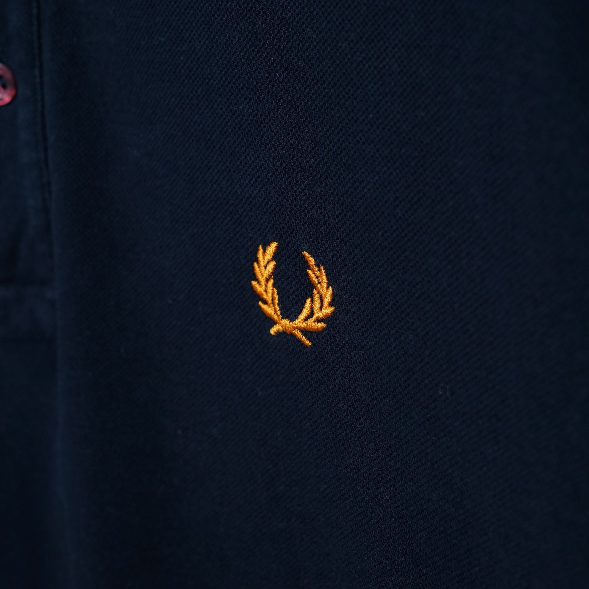 Deep navy pique body with classic tipped collar in blue and yellow, finished with the laurel wreath embroidery.