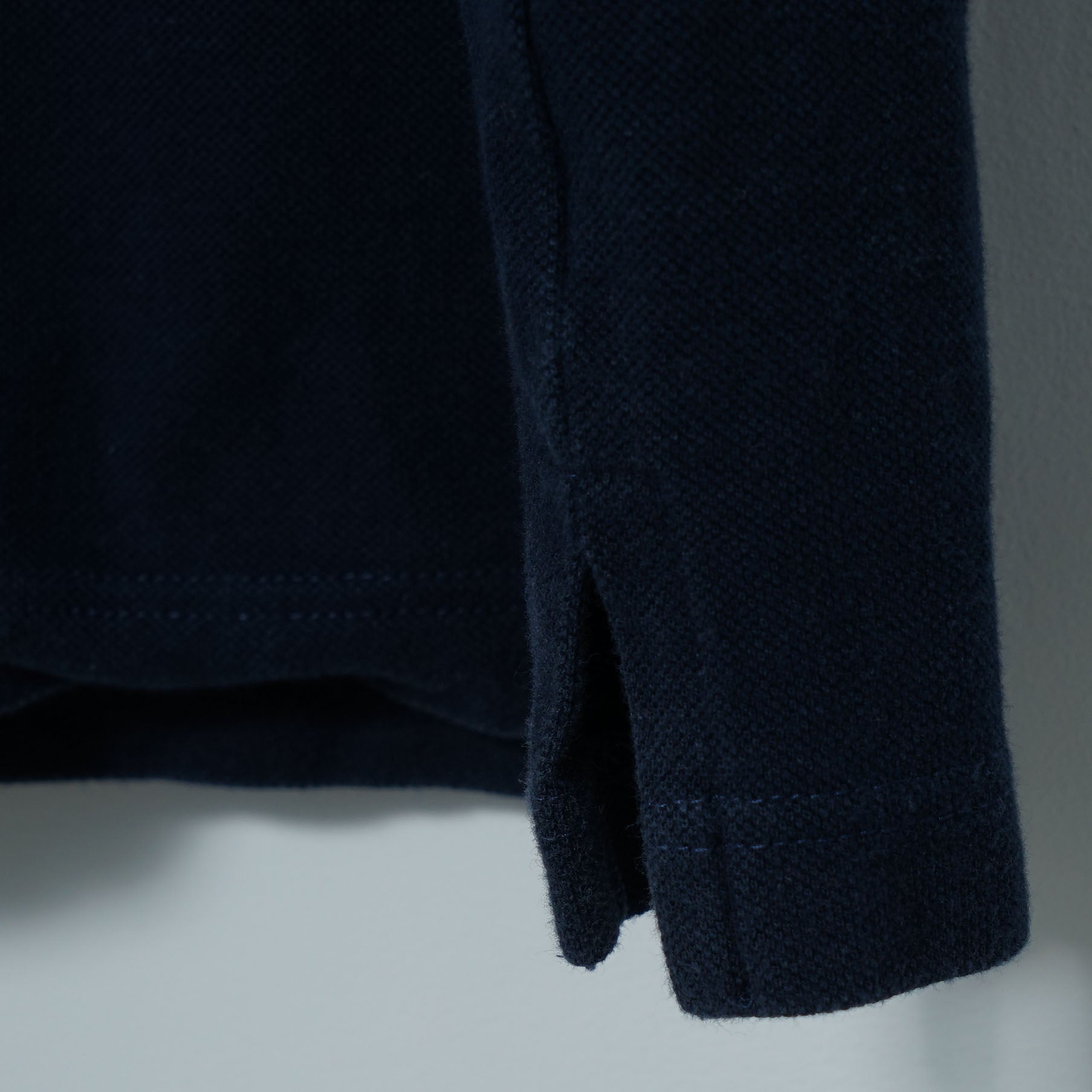 深いネイビーの鹿の子ボディに、襟先のブルー×イエローのティップが効いたロングスリーブポロ。