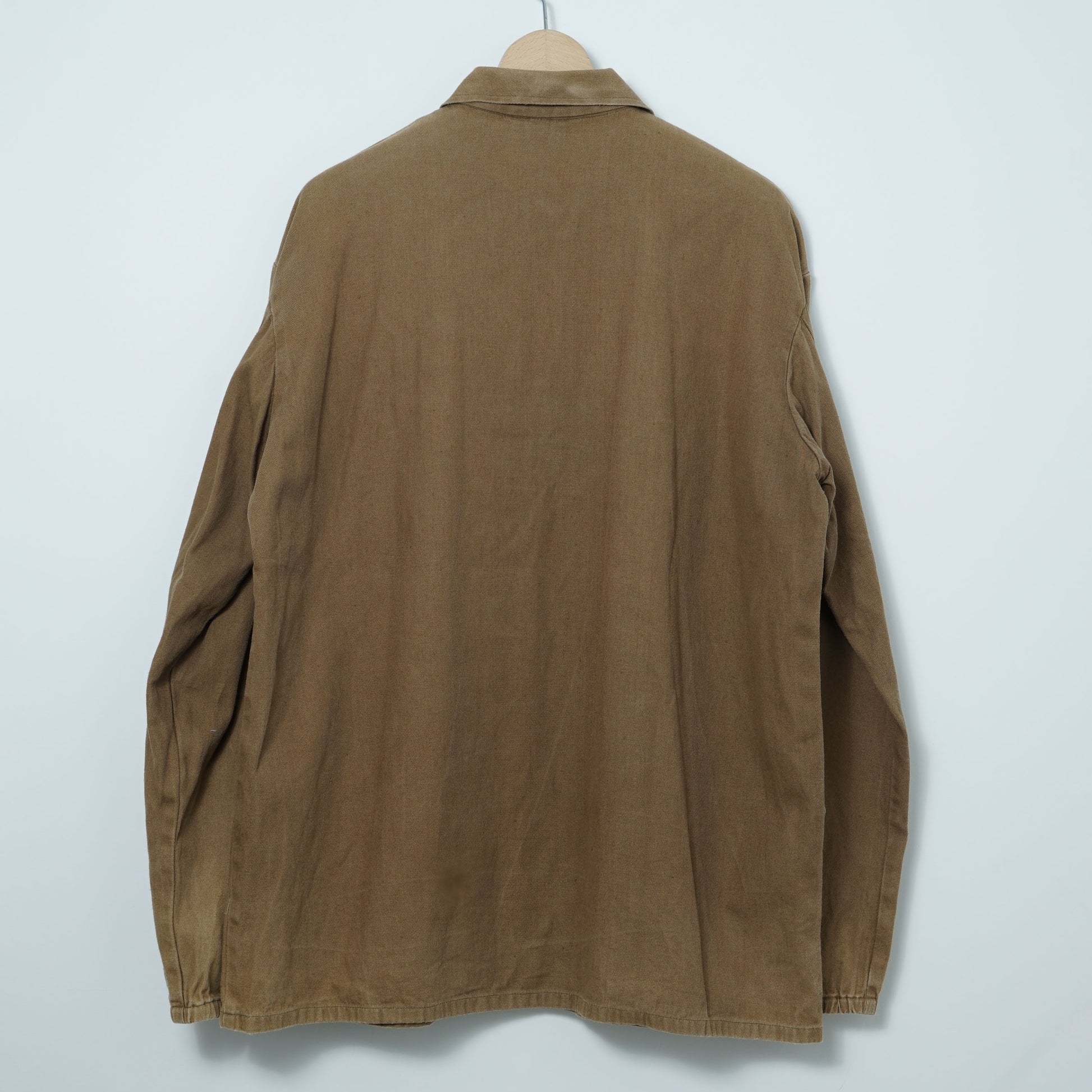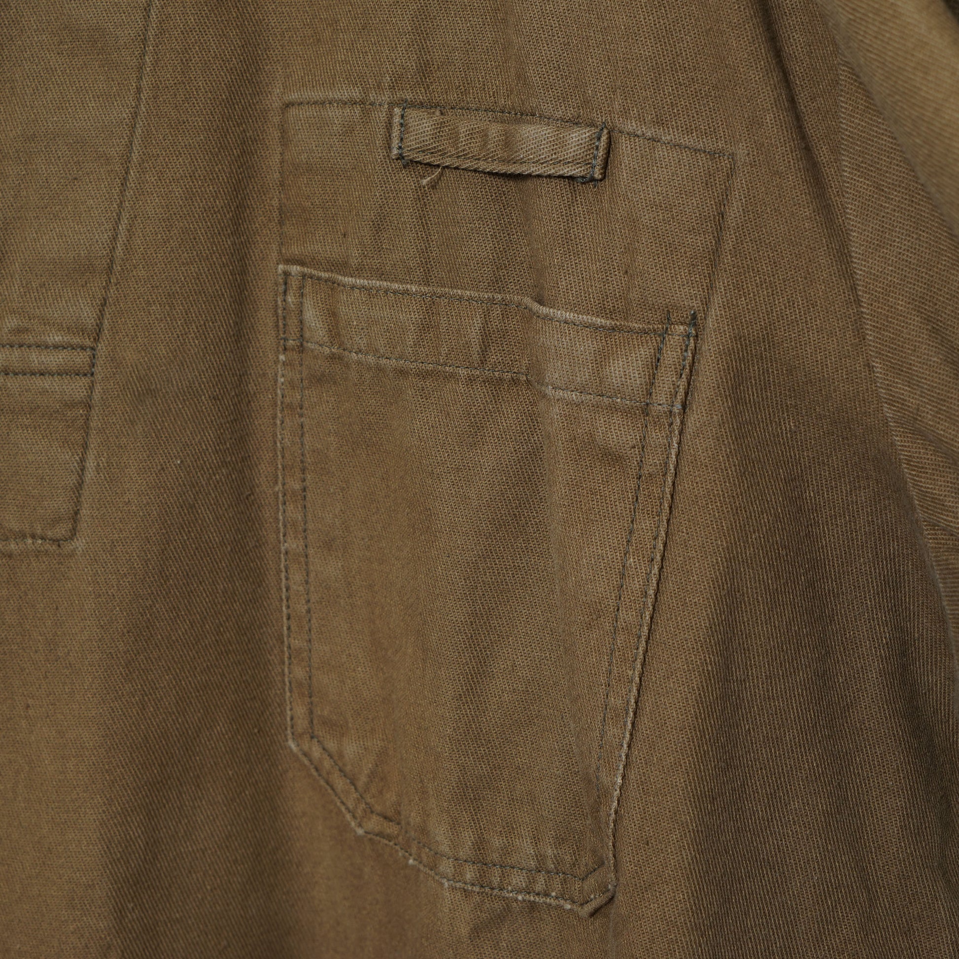 胸元のポケットには、道具や筆記具を想定したループが配され、ミリタリー/ワーク由来ならではの合理性が感じられます。生地はコットン主体の平織りファブリック。
