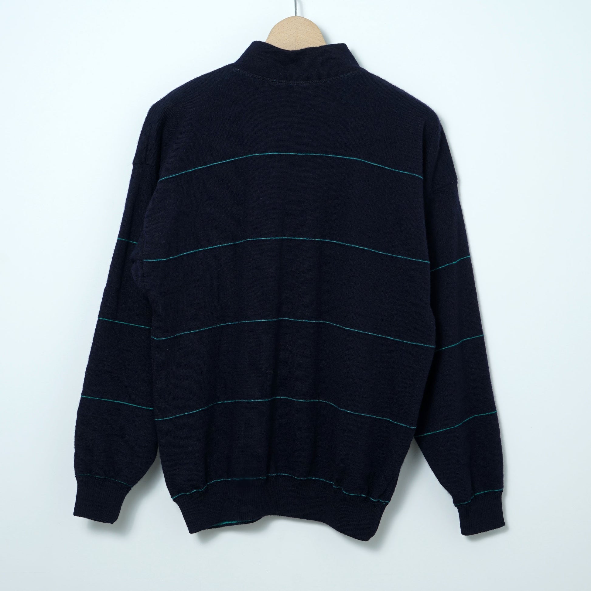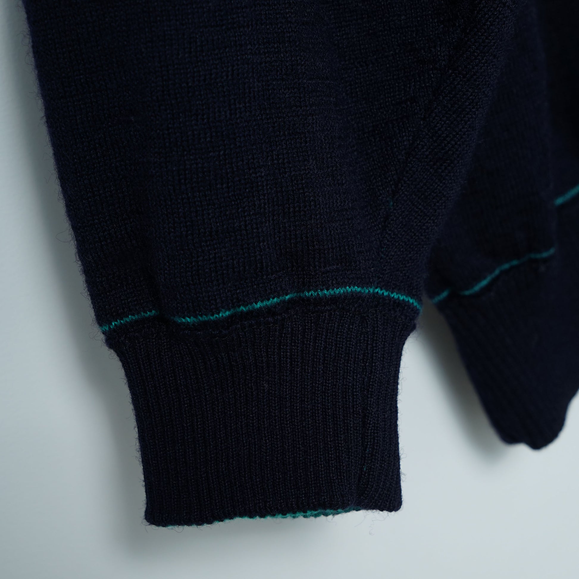 デンマーク製のL.L.Beanハーフジップニット。深いネイビーにティールの細ラインが静かに走る、上品な一枚です。