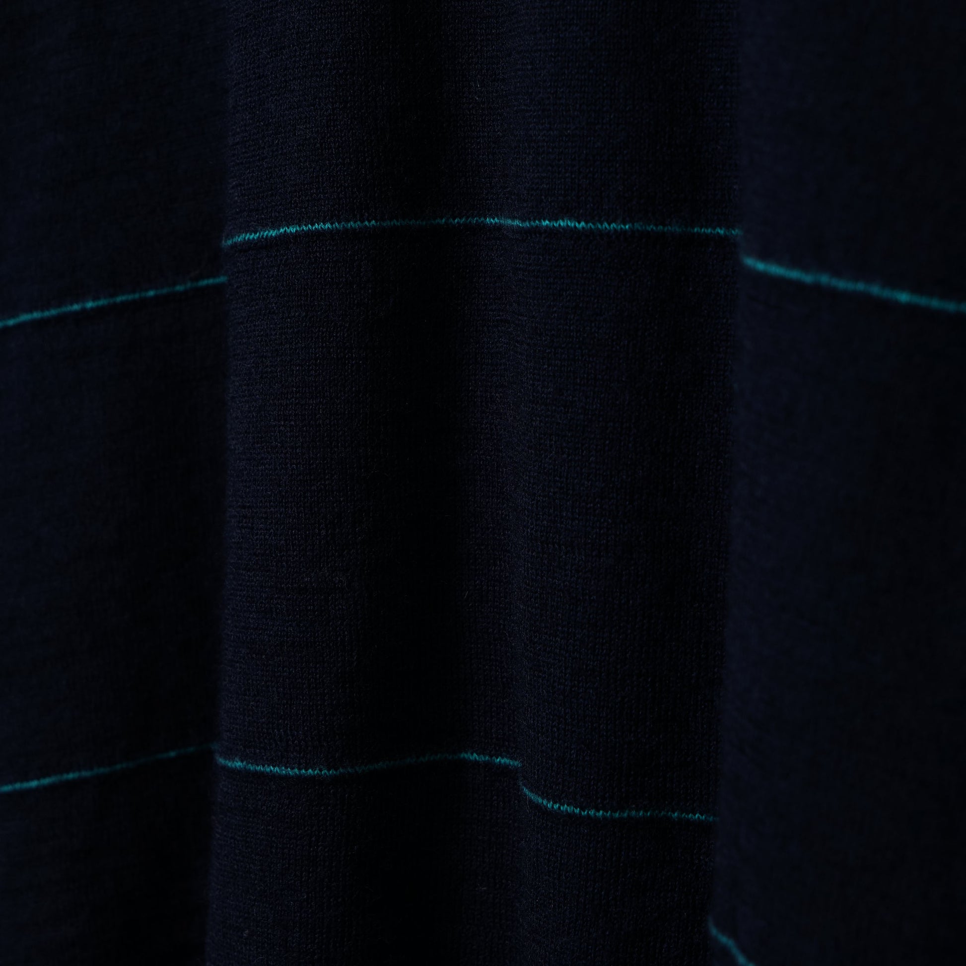 Deep navy with subtle teal pinstripes, crafted in a double-layer knit: wool outer with a soft cotton inner for comfort. Underarm gussets enhance mobility.