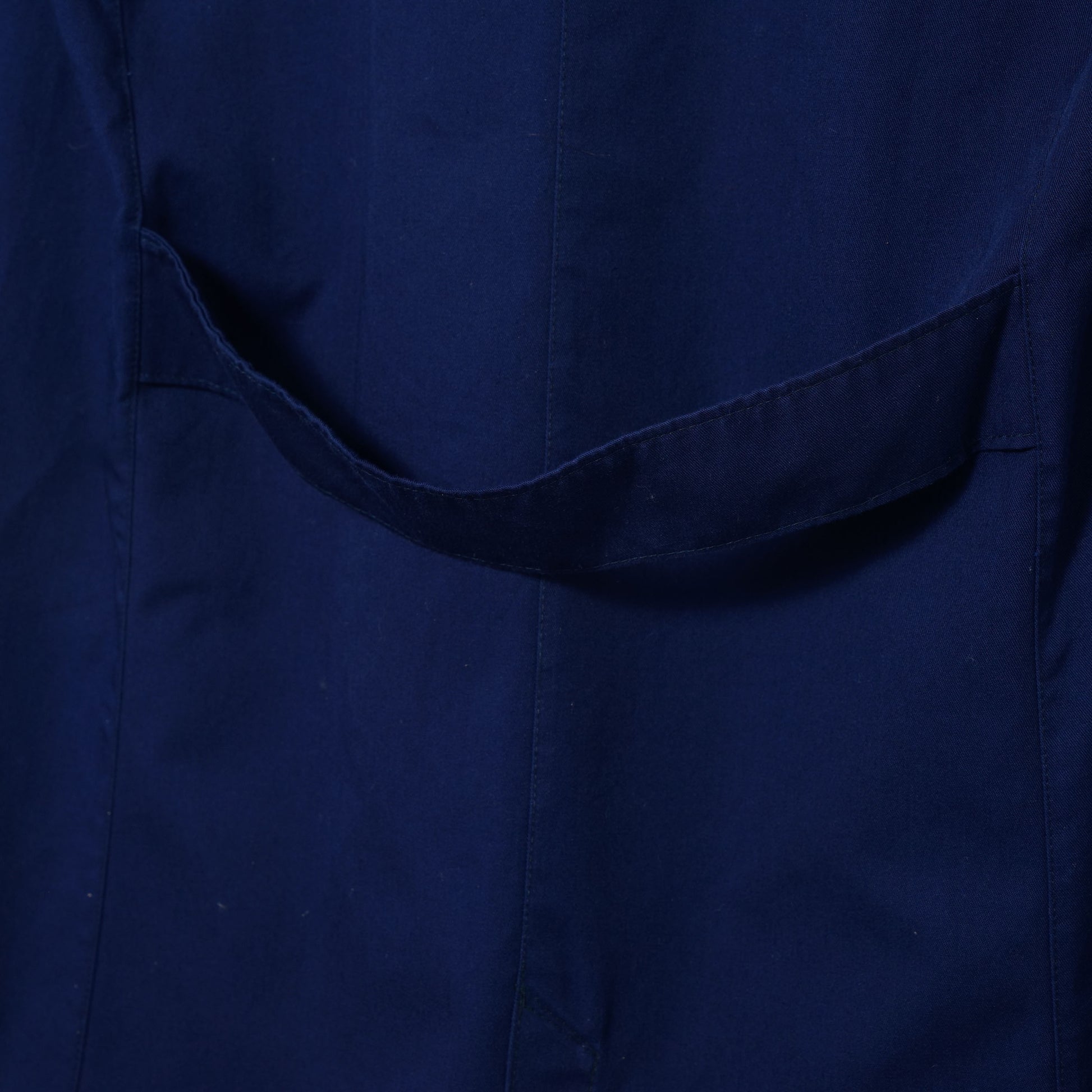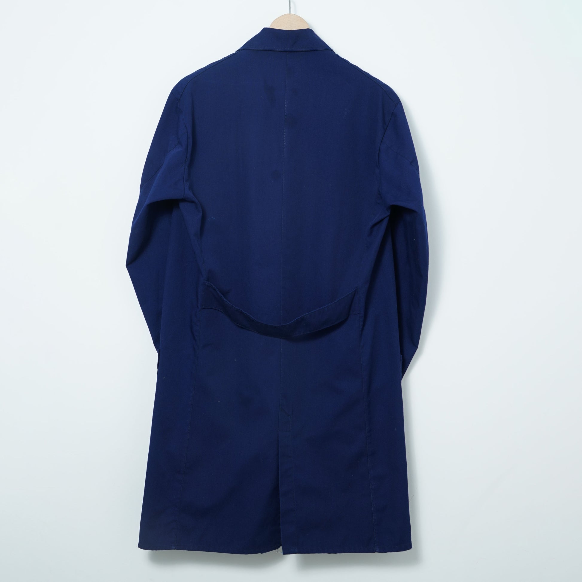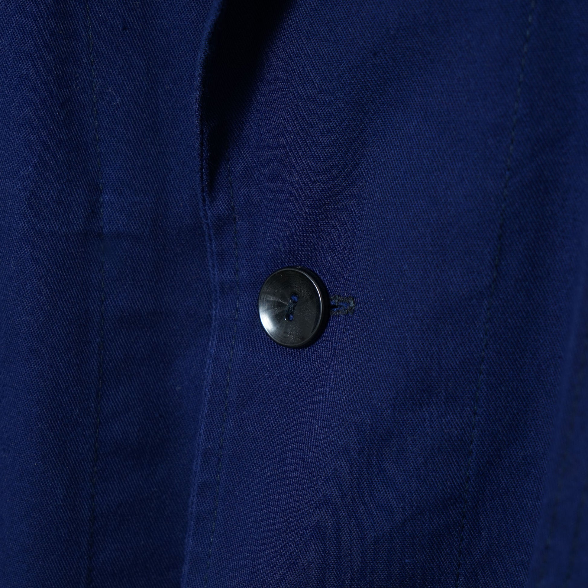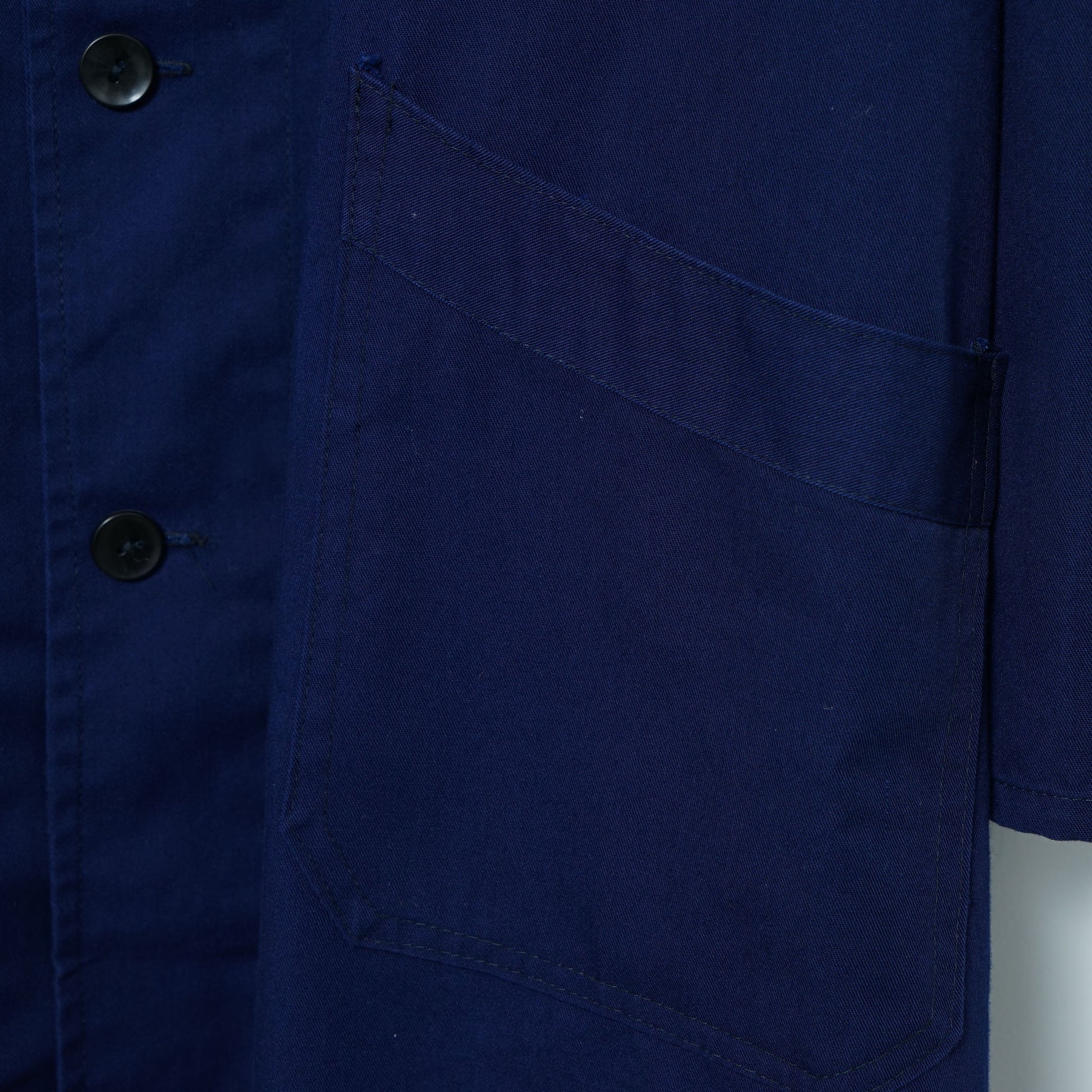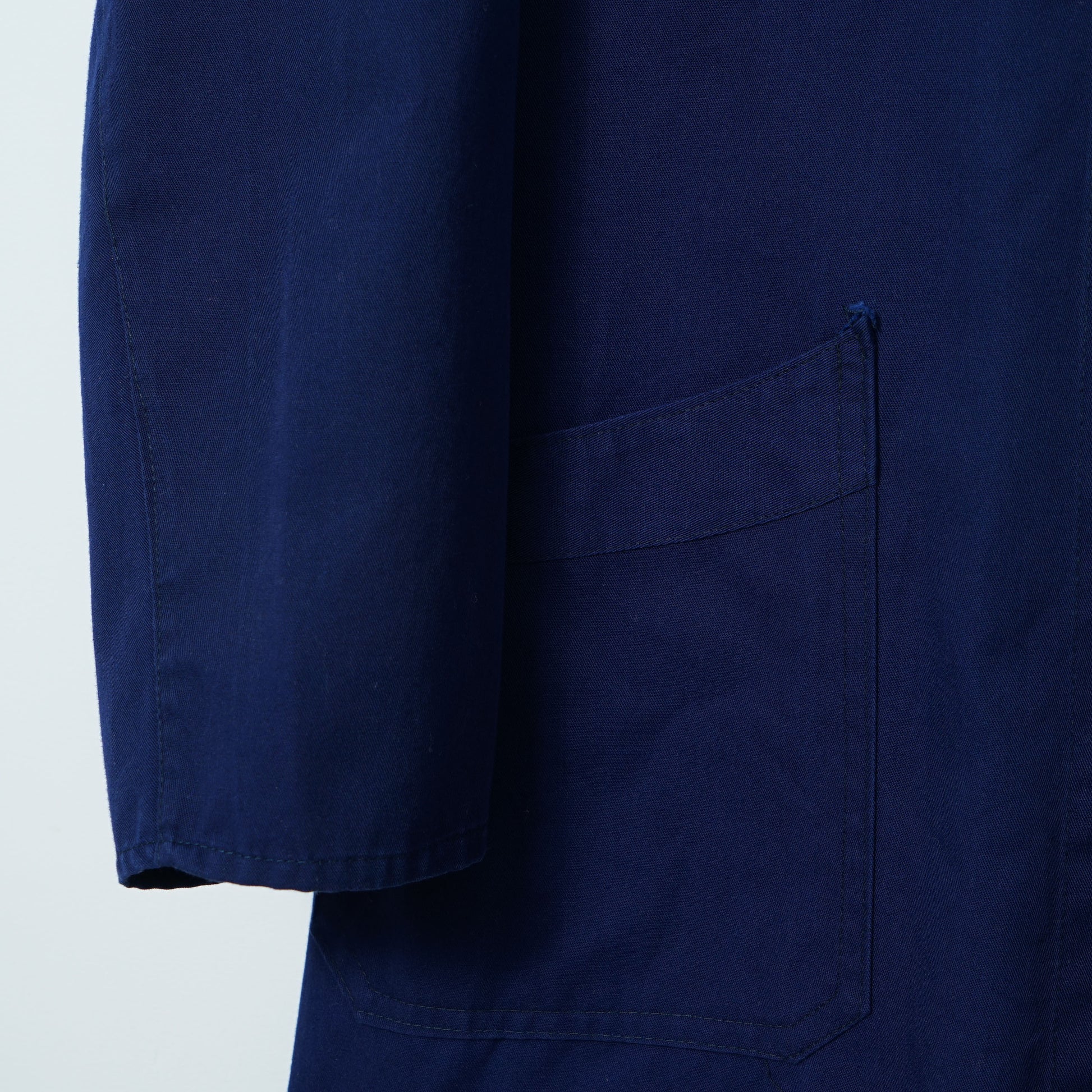 フレンチワークを象徴する、深く澄んだブルーのアトリエコート。無駄のないAラインシルエットに、端正な4ボタンフロント。大きなパッチポケットと背面のアクションプリーツが、実用のために設計された美しさをさりげなく物語ります。
