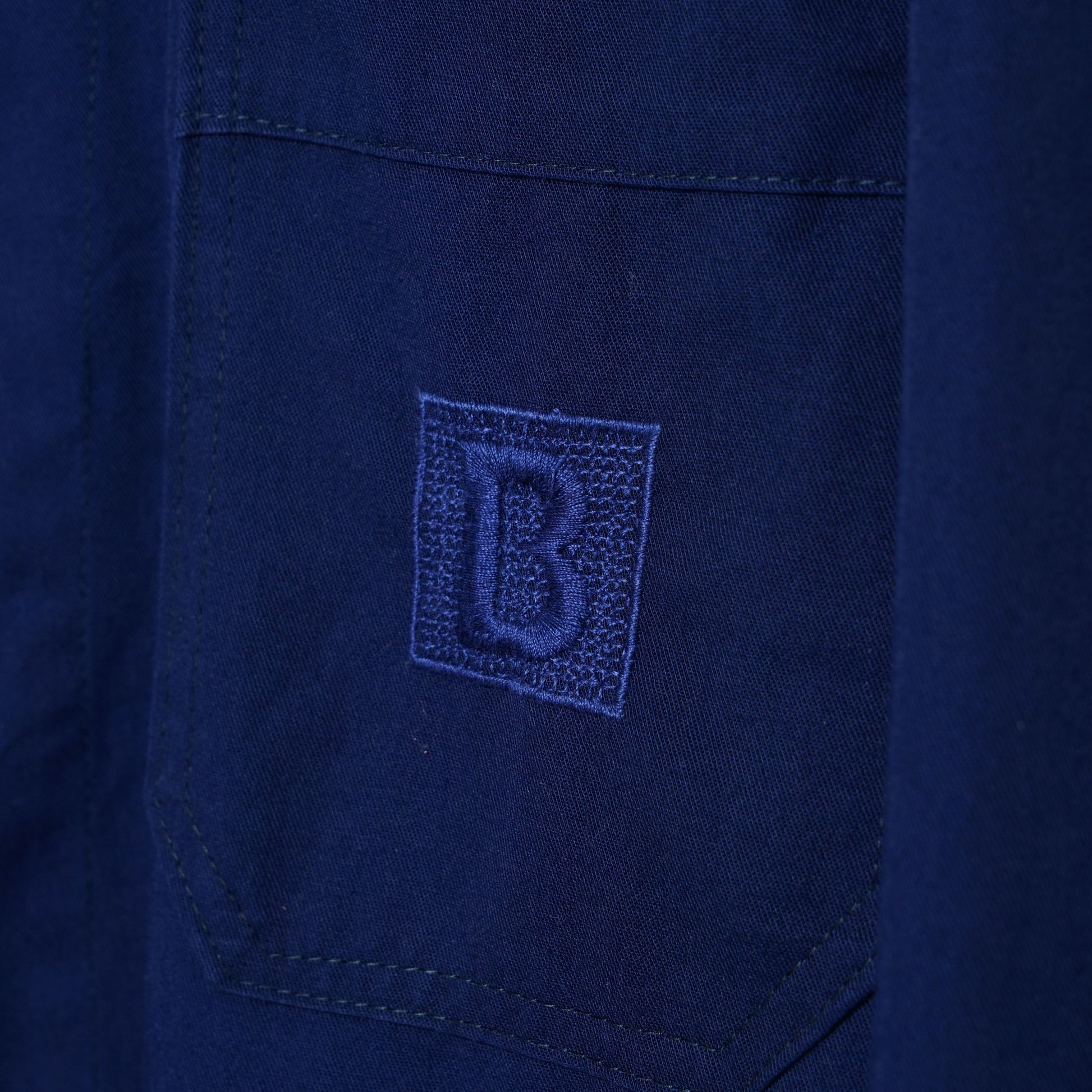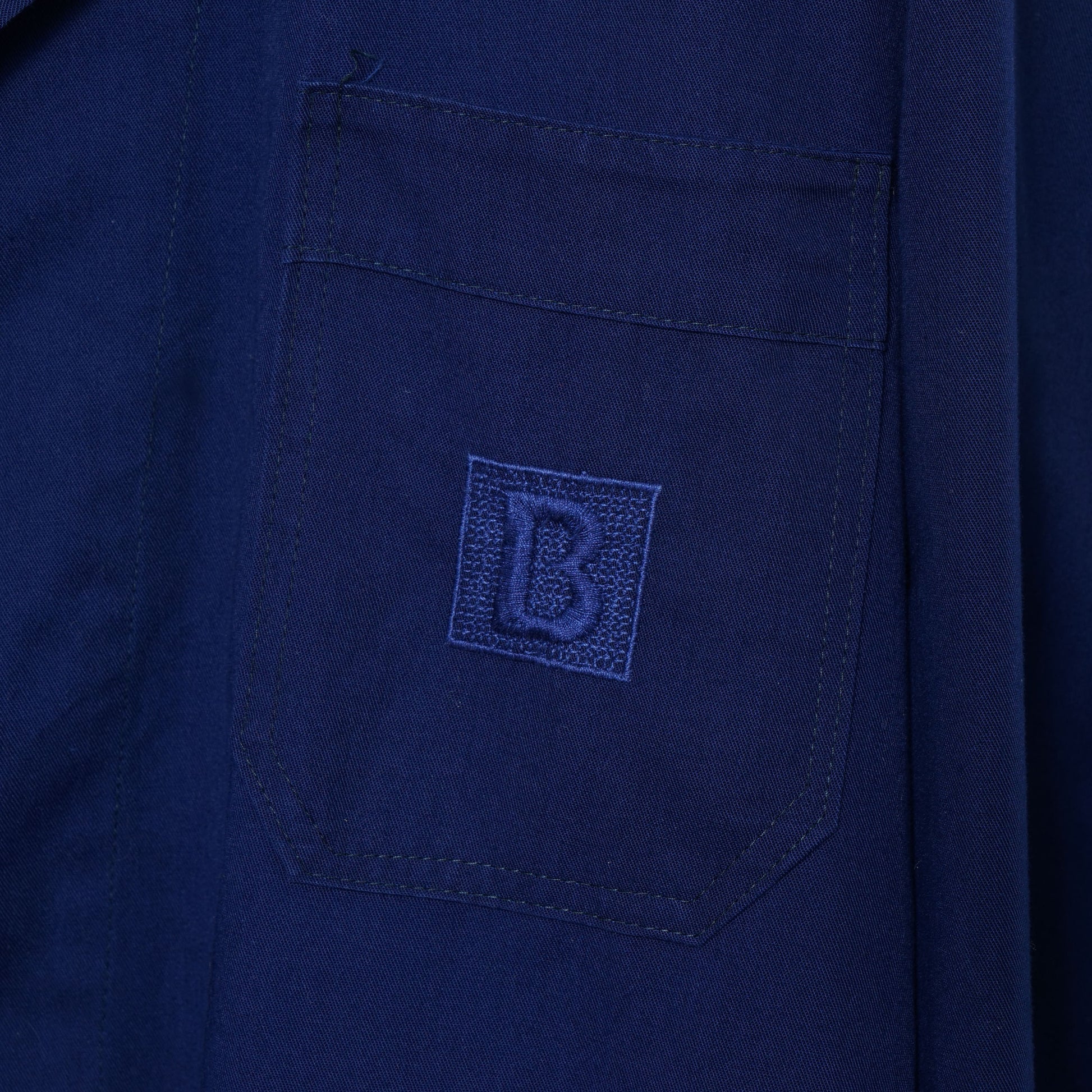 A classic French blue atelier coat with a clean 4-button front and a subtle “B” embroidered patch on the chest pocket.