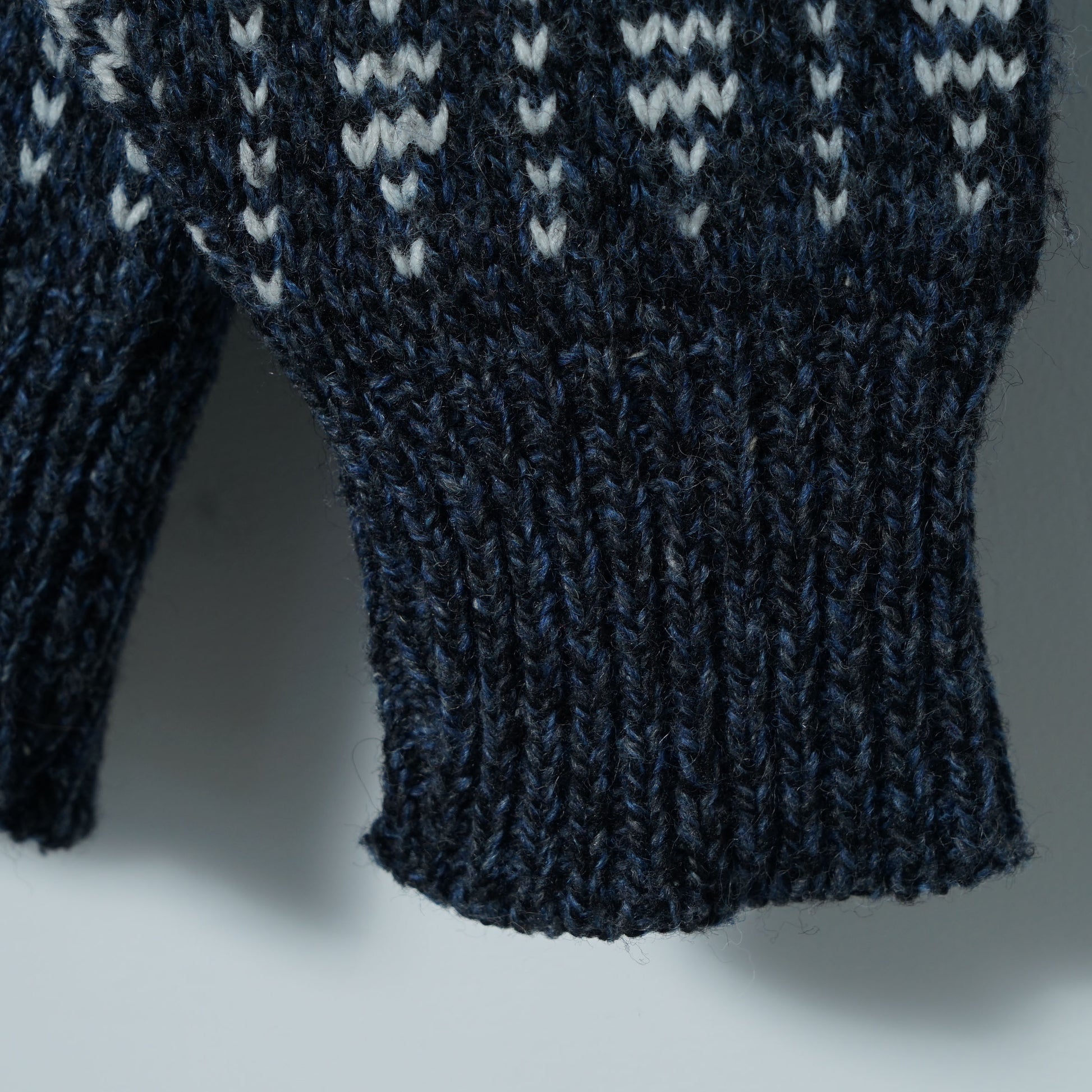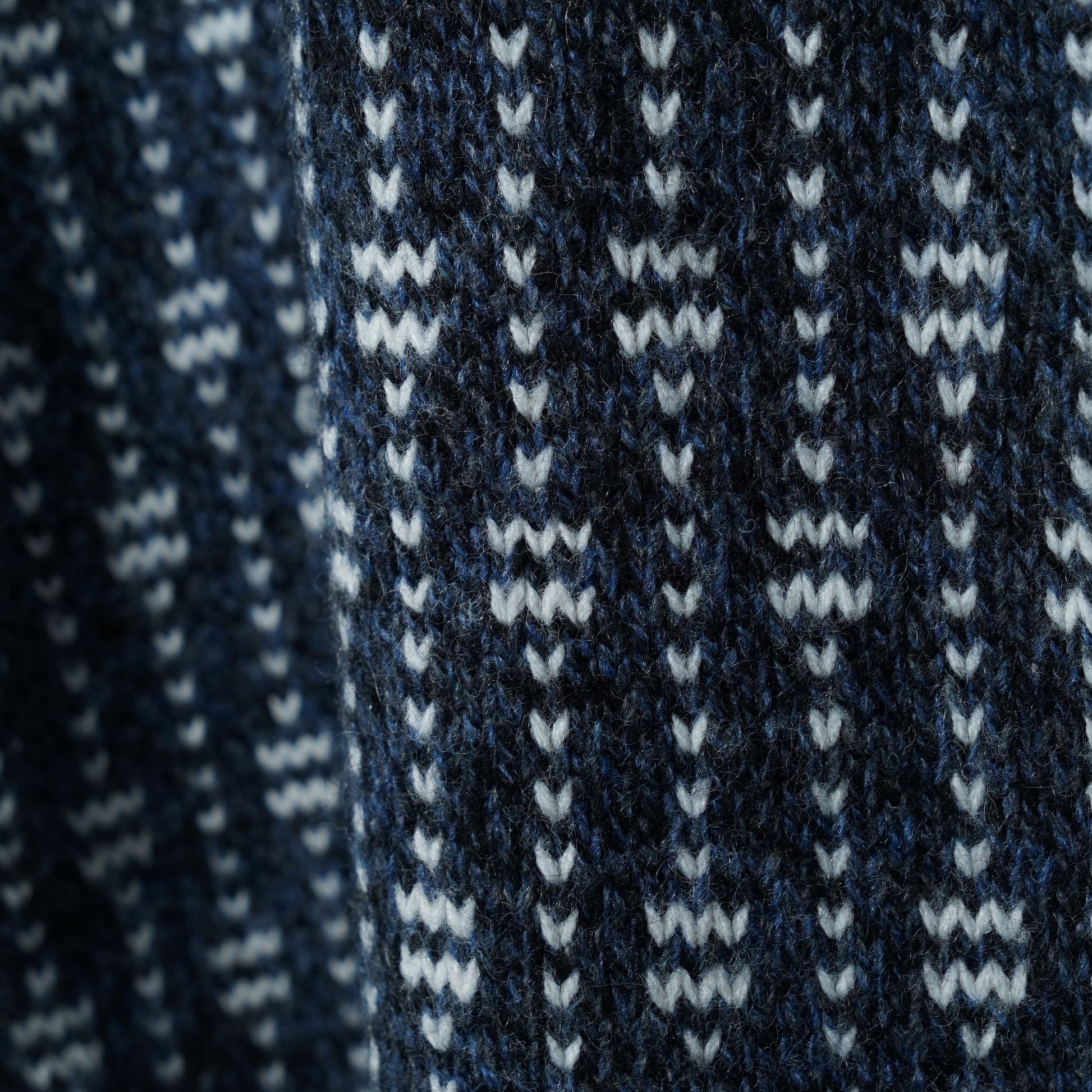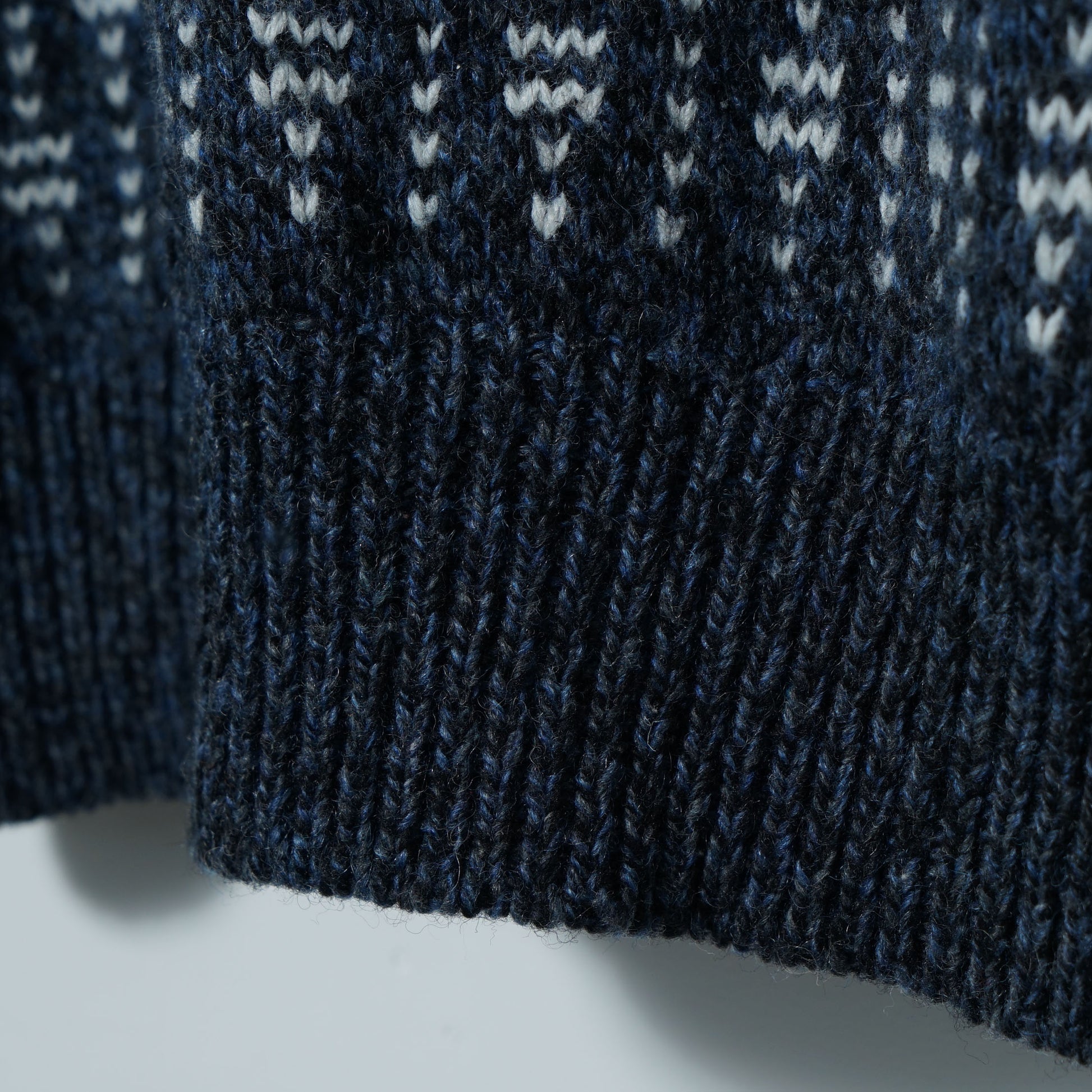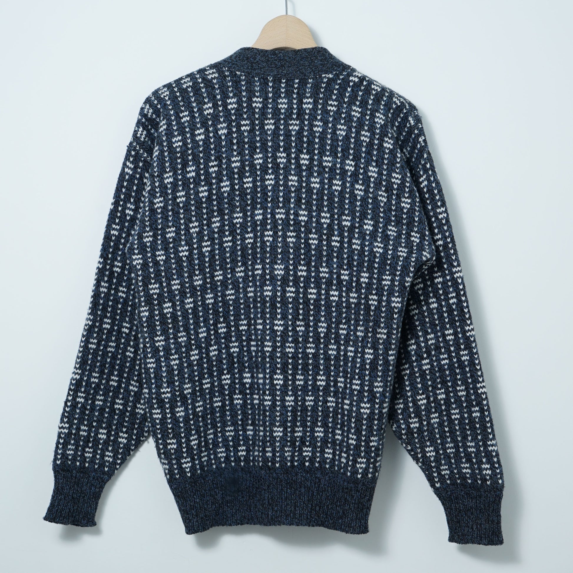 深いネイビーにホワイトの柄がリズム良く入る、総柄ジャカードのウールカーディガン。
