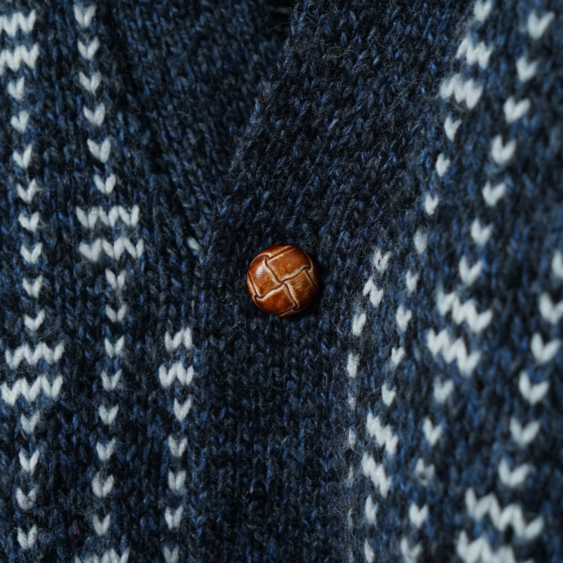 Features a navy-and-white all-over jacquard pattern and warm wooden buttons.