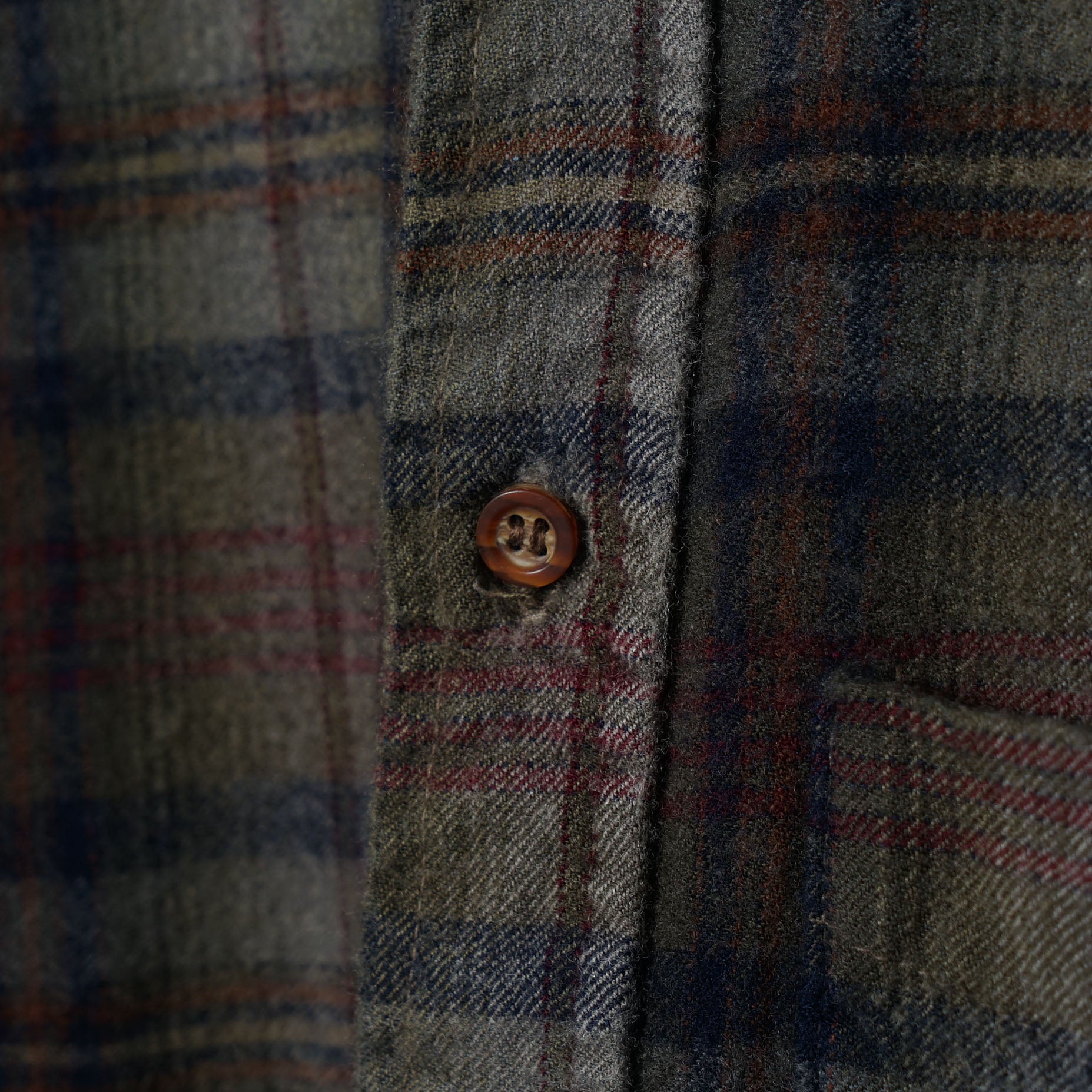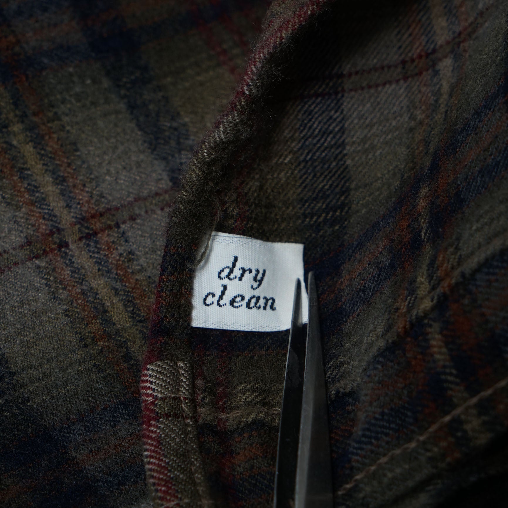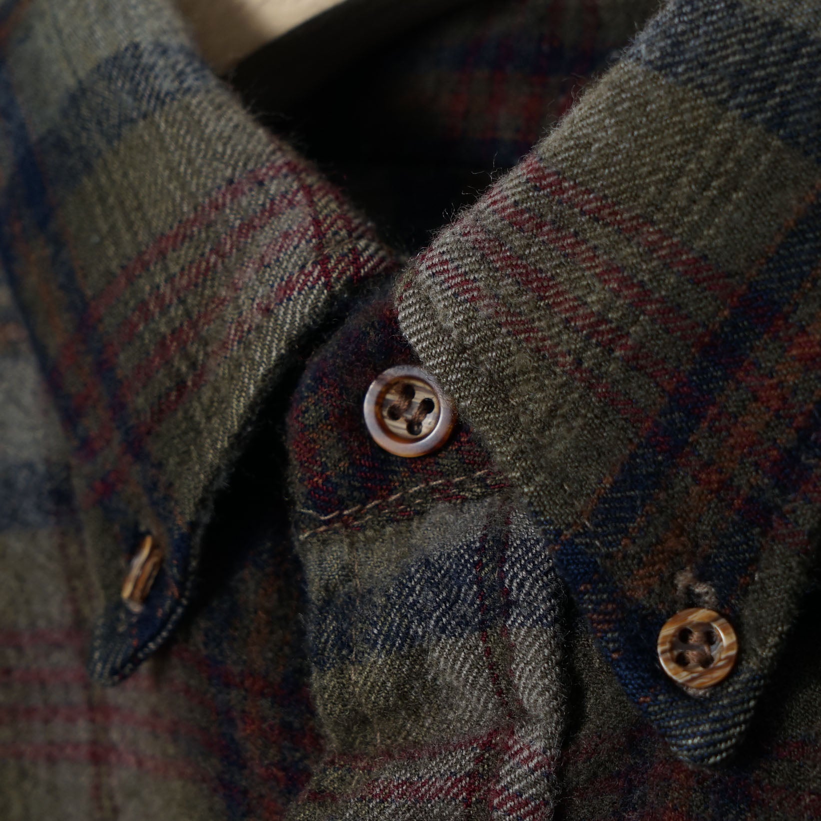 しっとりと起毛したピュアヴァージンウールに、オリーブ〜グレーをベースにした落ち着いたチェック。 ネイビーのラインが奥行きを作り、差し色のボルドーが控えめに表情を添える一着です。