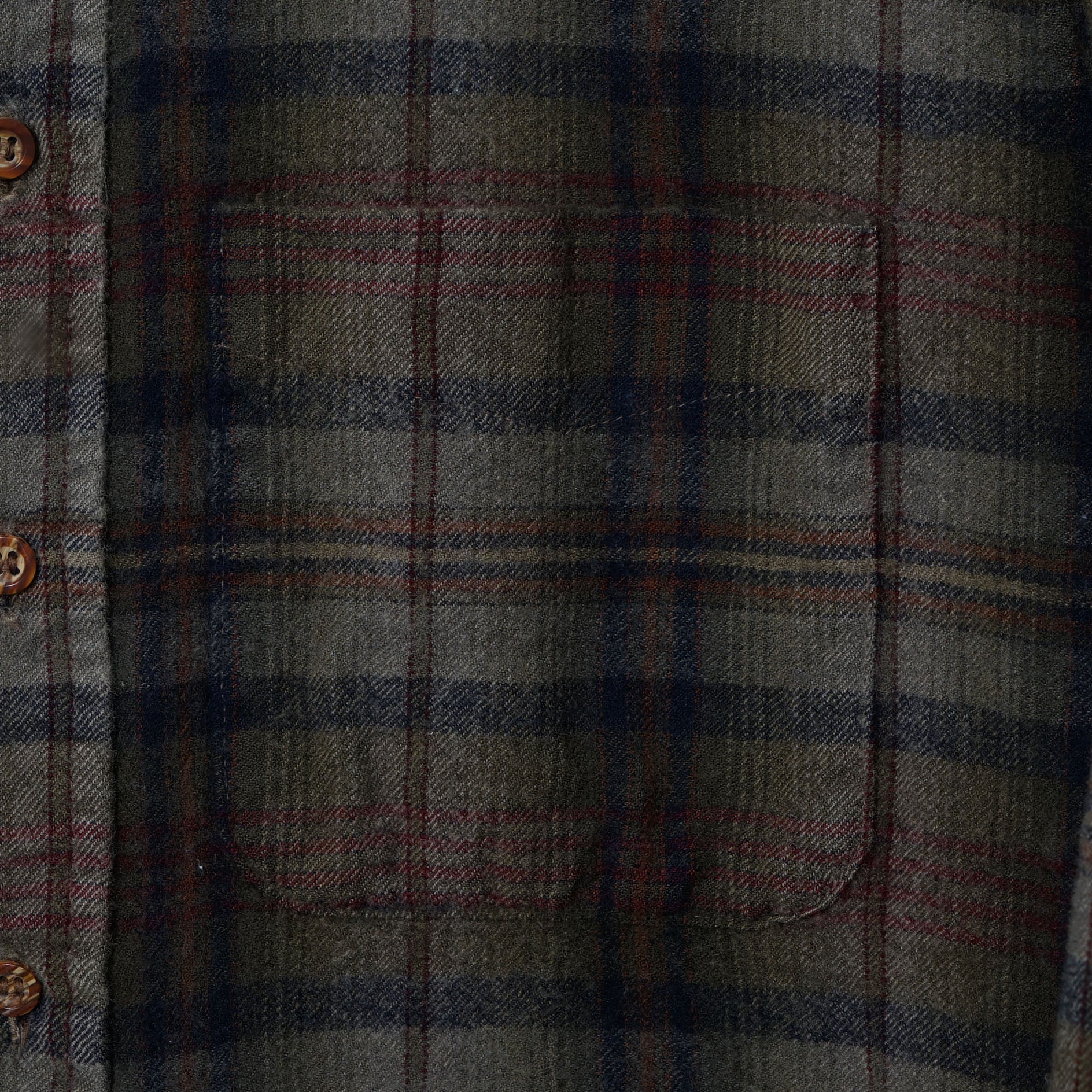 Soft brushed flannel with a muted olive-grey base, deep navy lines, and subtle burgundy accents — easy to layer and wear daily.