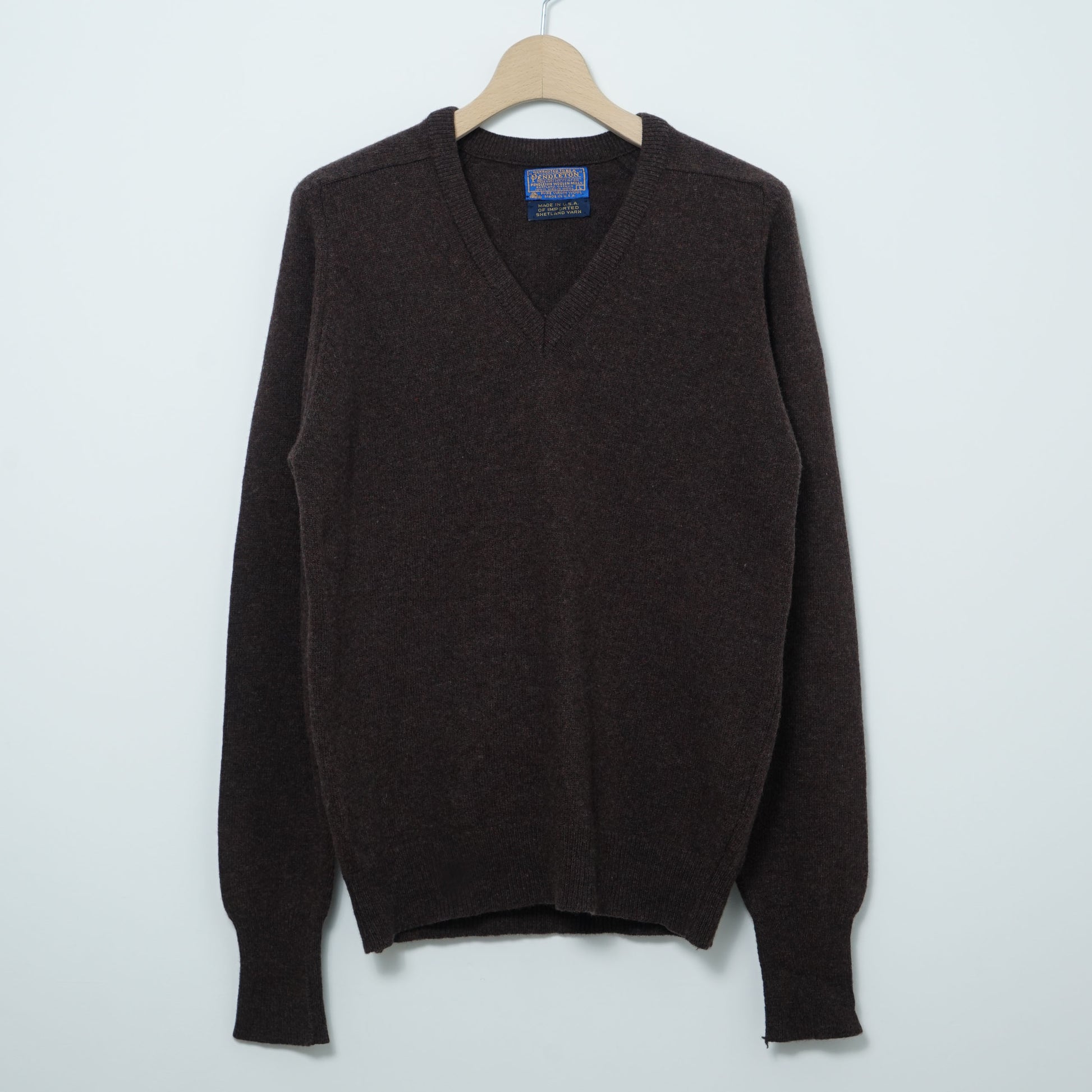 Vintage Pendleton Shetland wool V-neck sweater from around the 1970s–1980s, made in the USA using imported Shetland yarn.