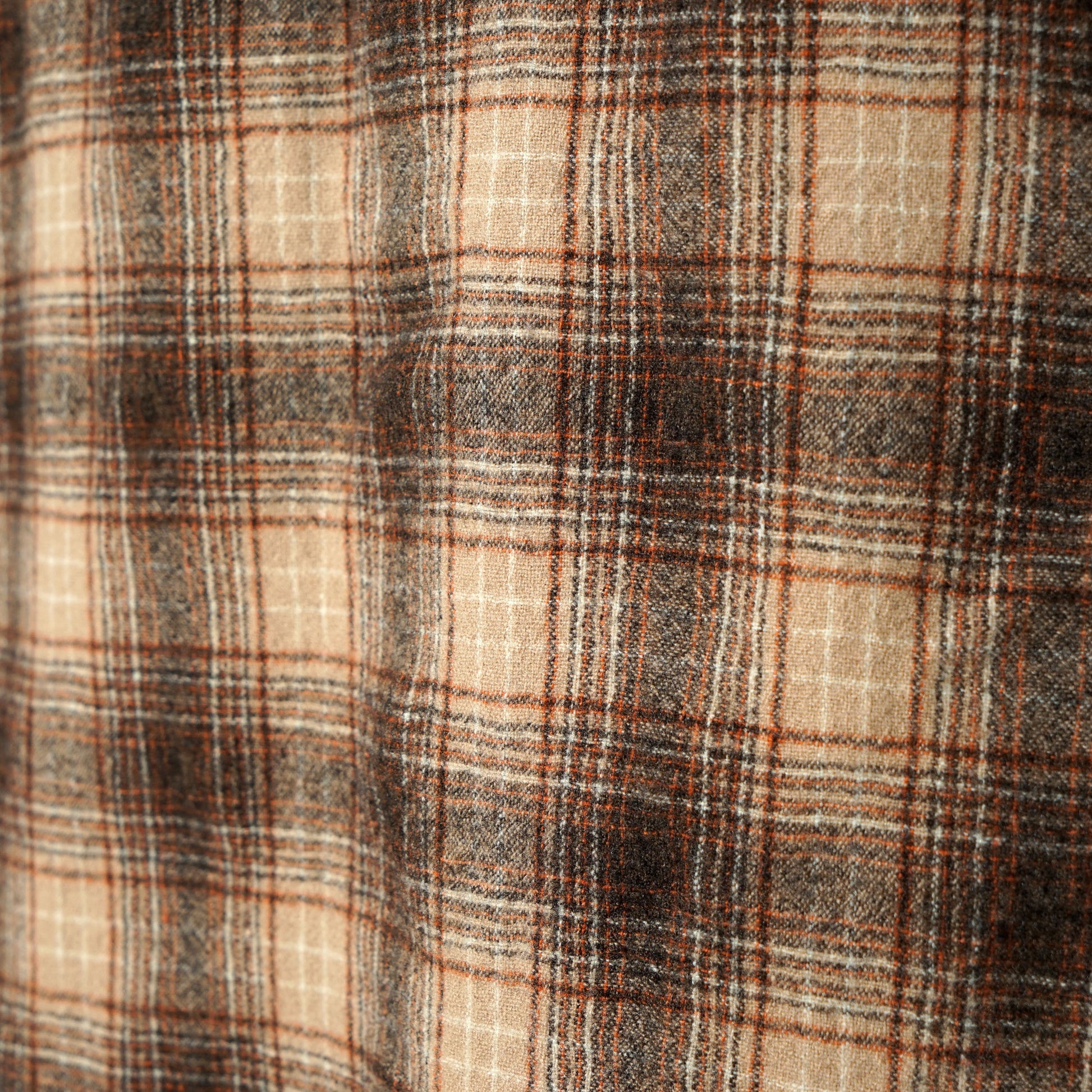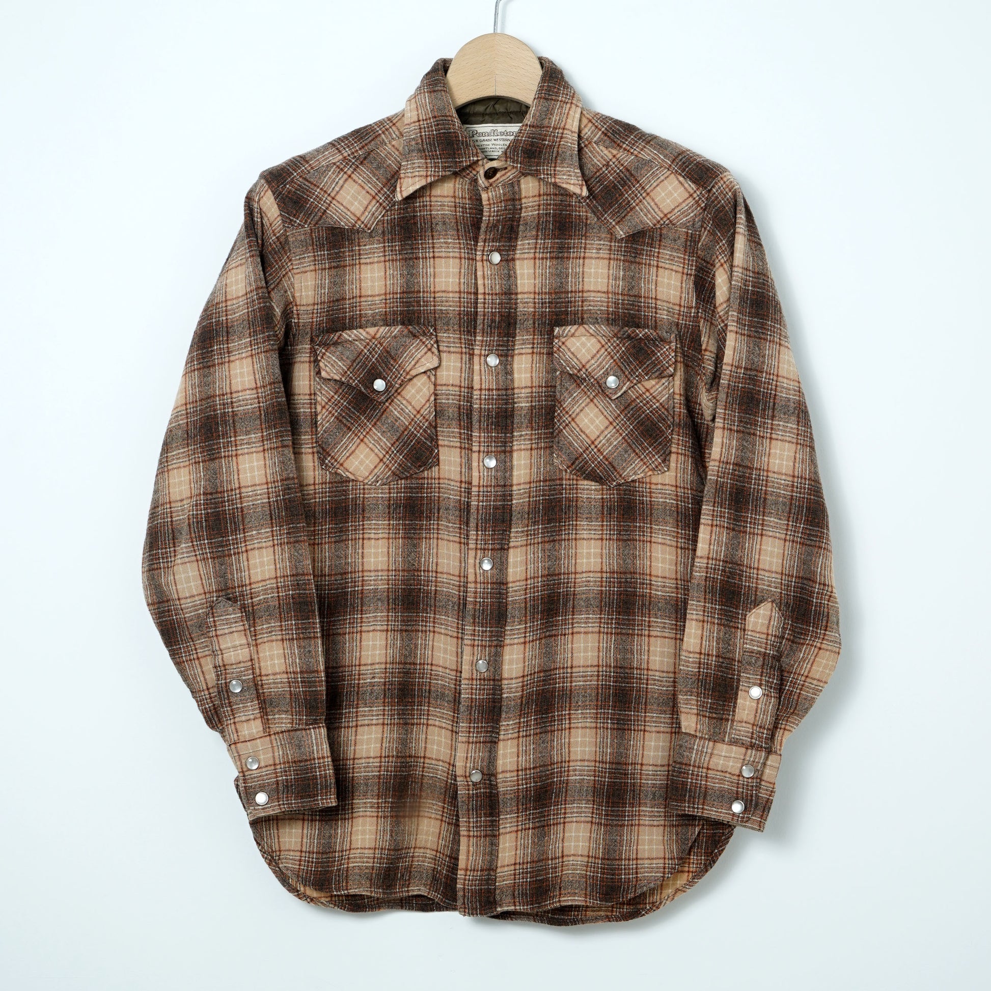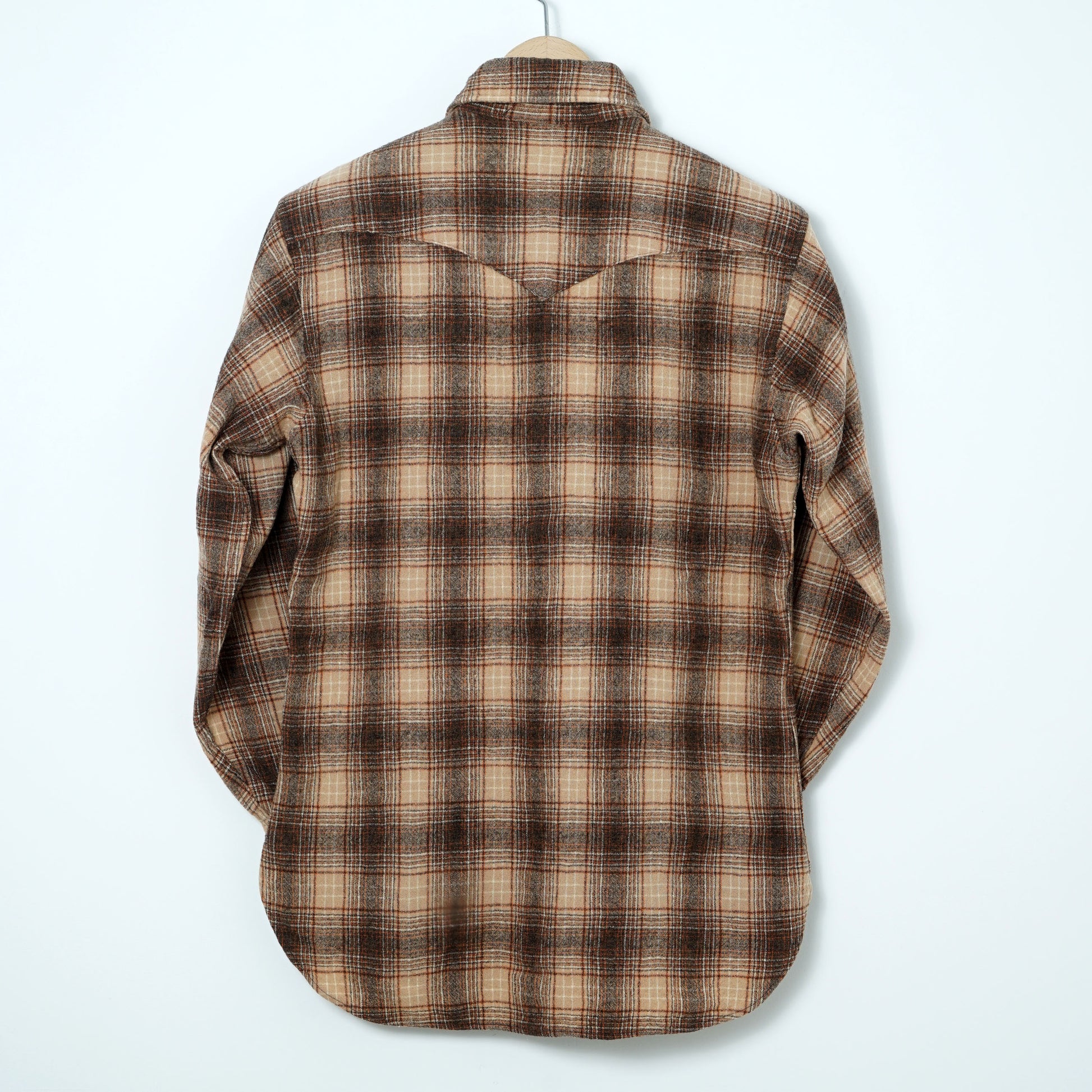 Soft virgin wool in a beige–brown plaid with subtle orange accents, finished with pearl snaps and classic western yokes.