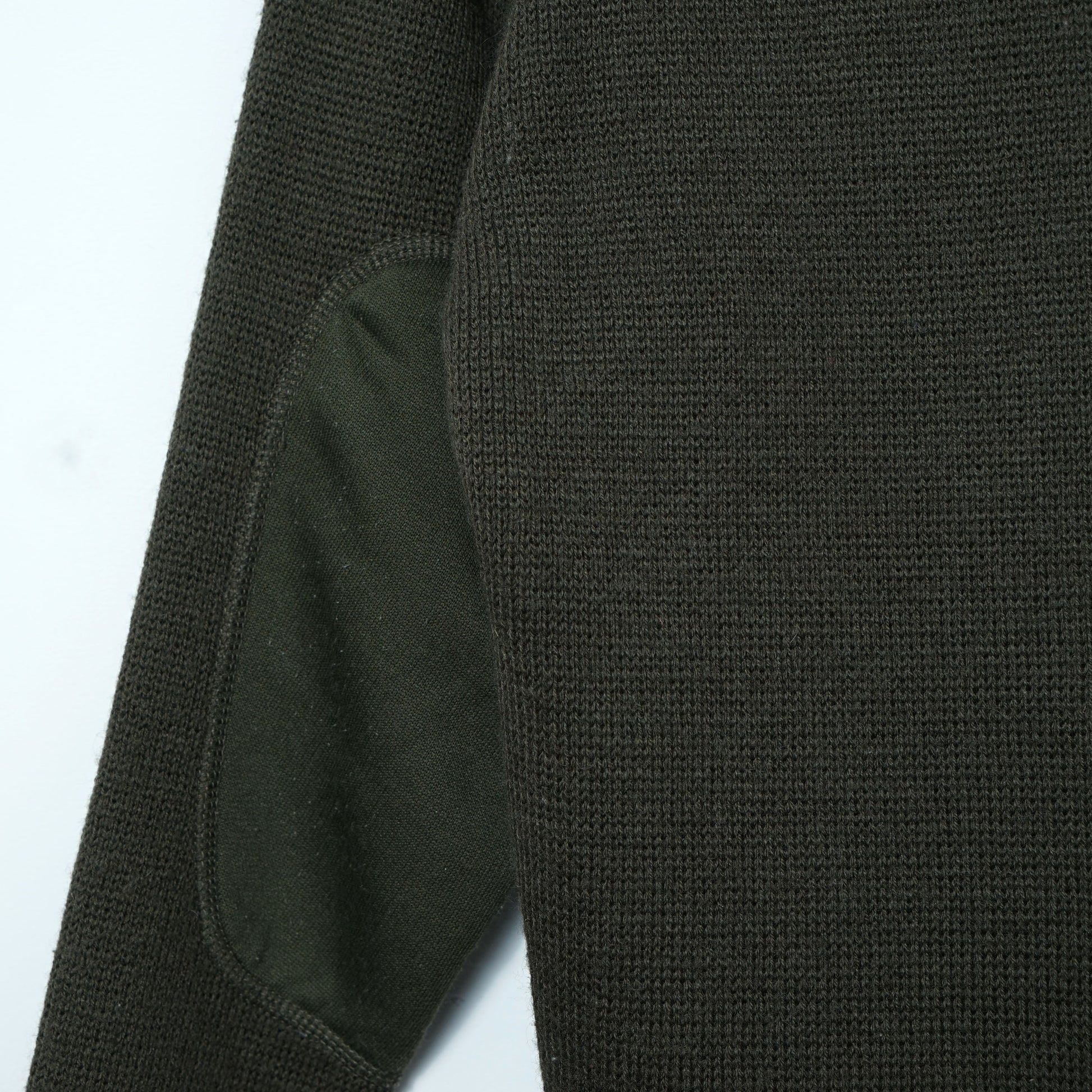 ダークオリーブの“コマンドニット”。目の詰まったワッフル調の編み地に、肩の補強パネルとエルボーパッチ、エポレットを備えた実用的なディテール。