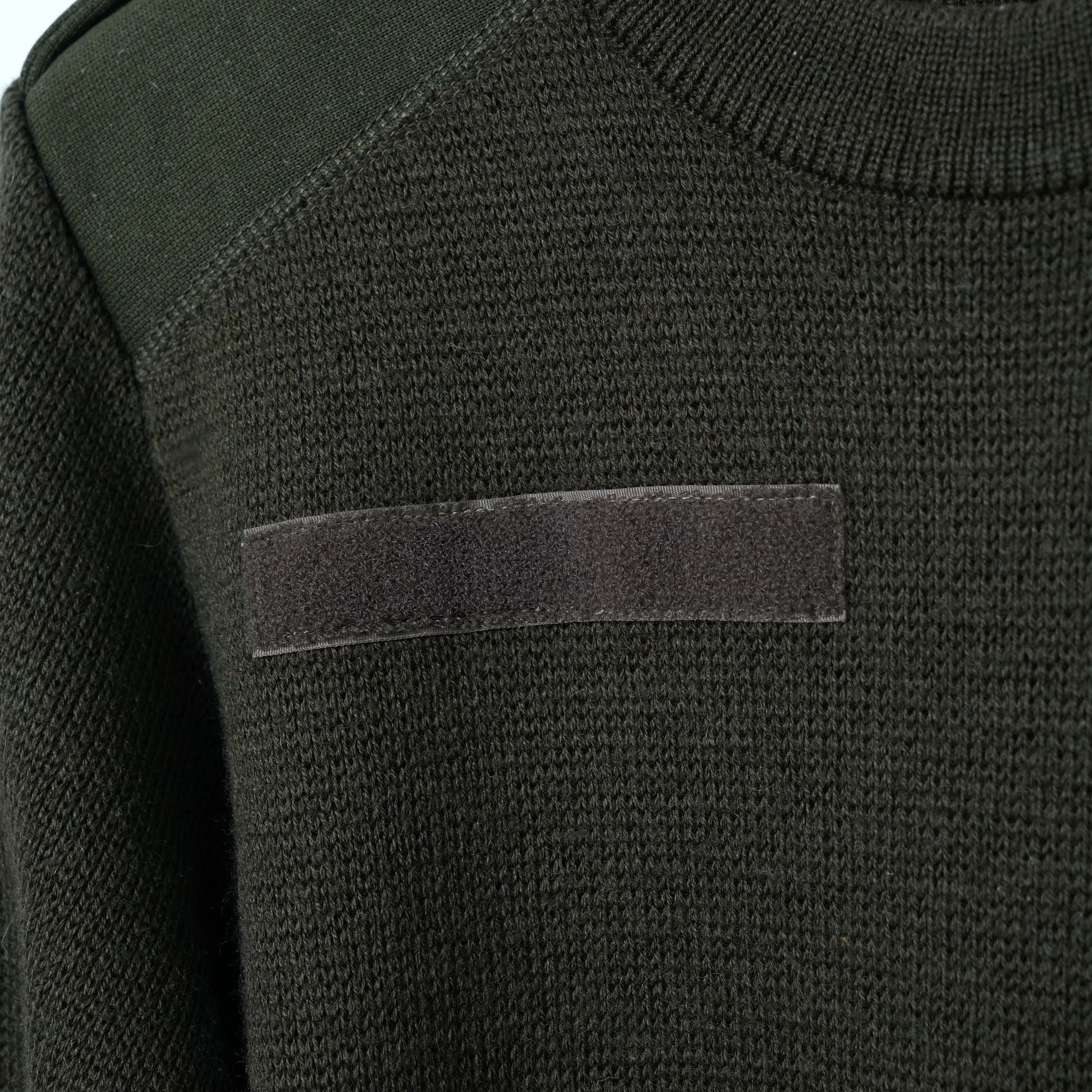 Dense waffle-knit texture in deep olive, featuring reinforced shoulder panels, elbow patches, epaulettes, and a Velcro name-tape detail on the chest.