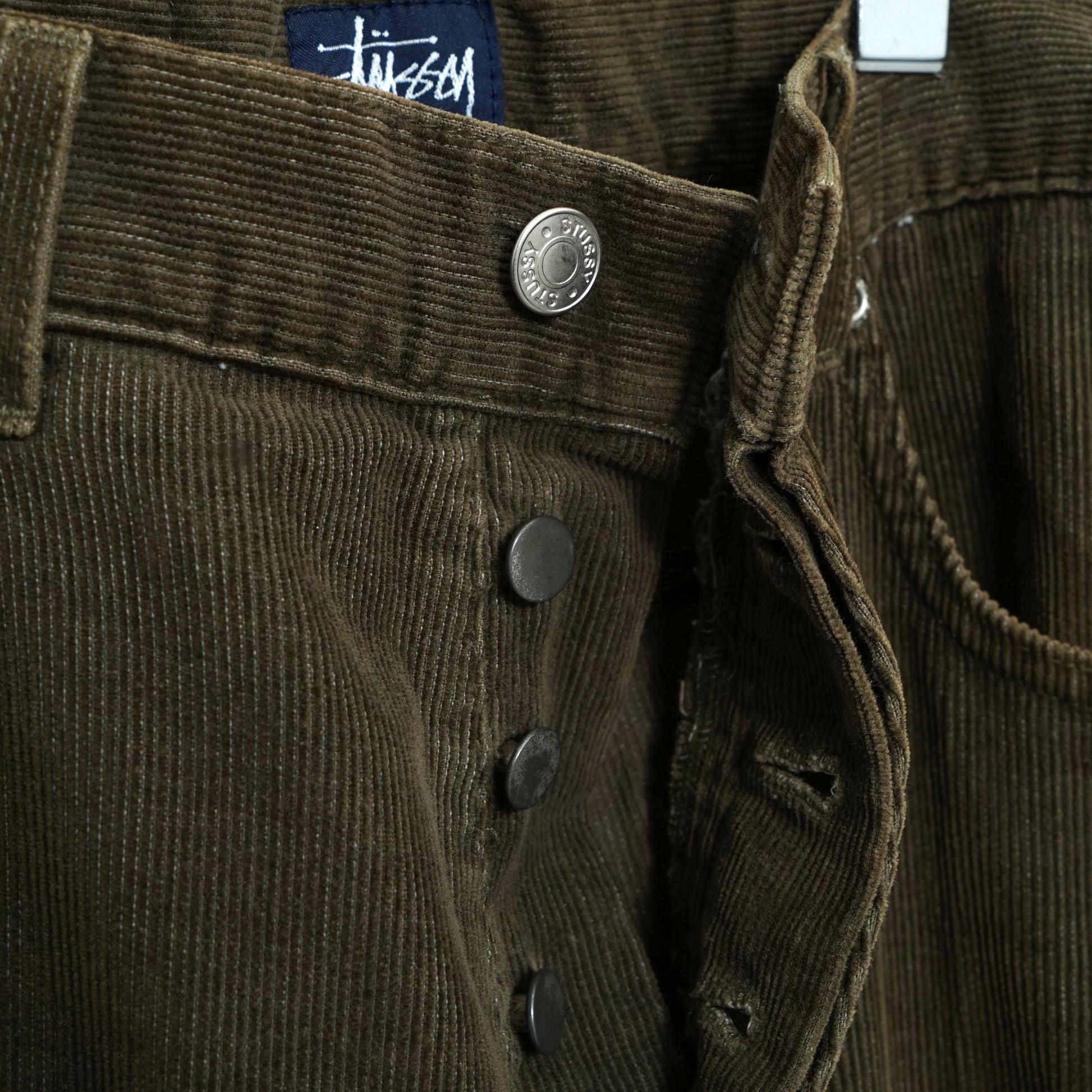Wide-wale texture, button fly and “STUSSY INTERNATIONAL” paper patch. Easy straight silhouette in olive-brown.