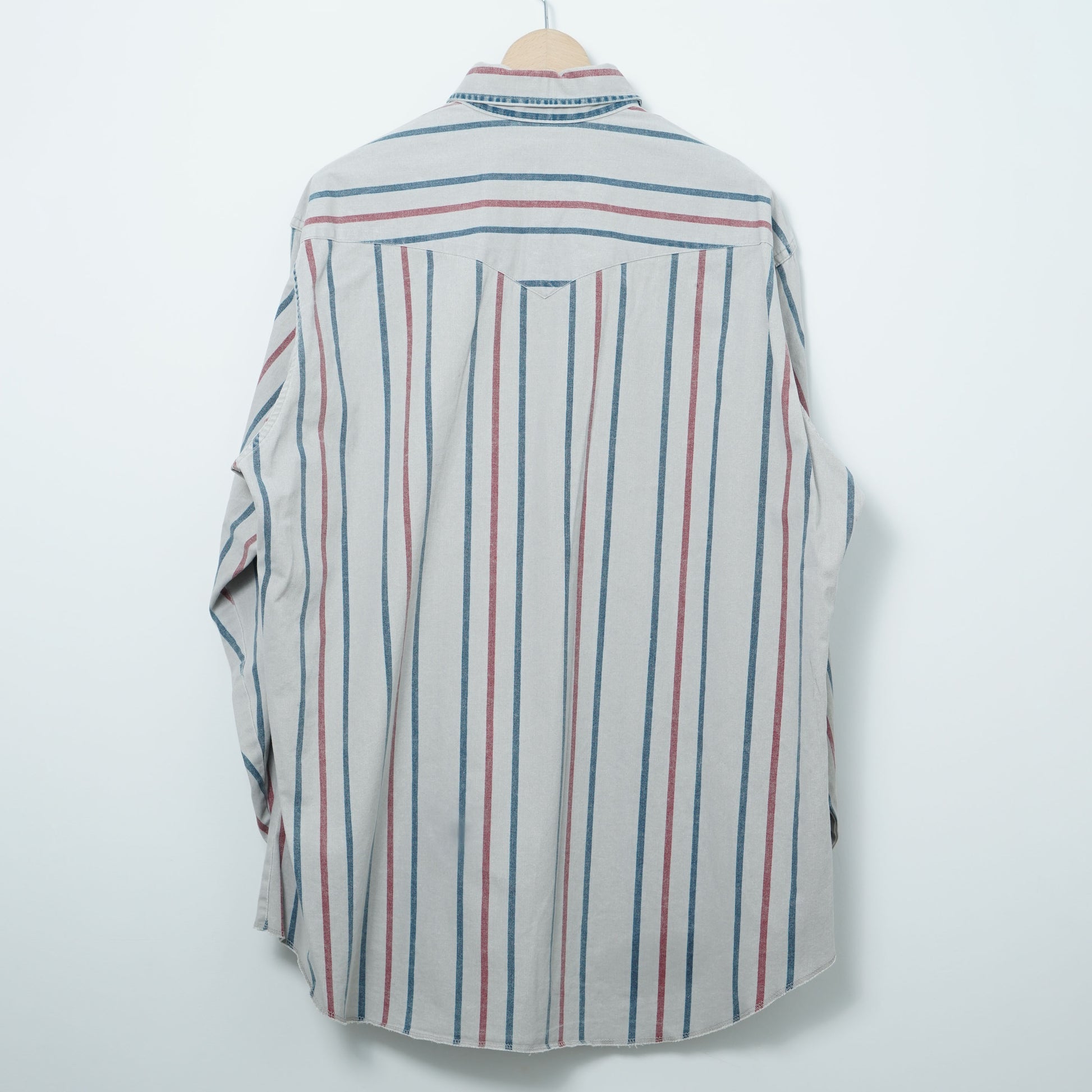 Vintage Wrangler western shirt in a calm grey base with blue/red stripes.