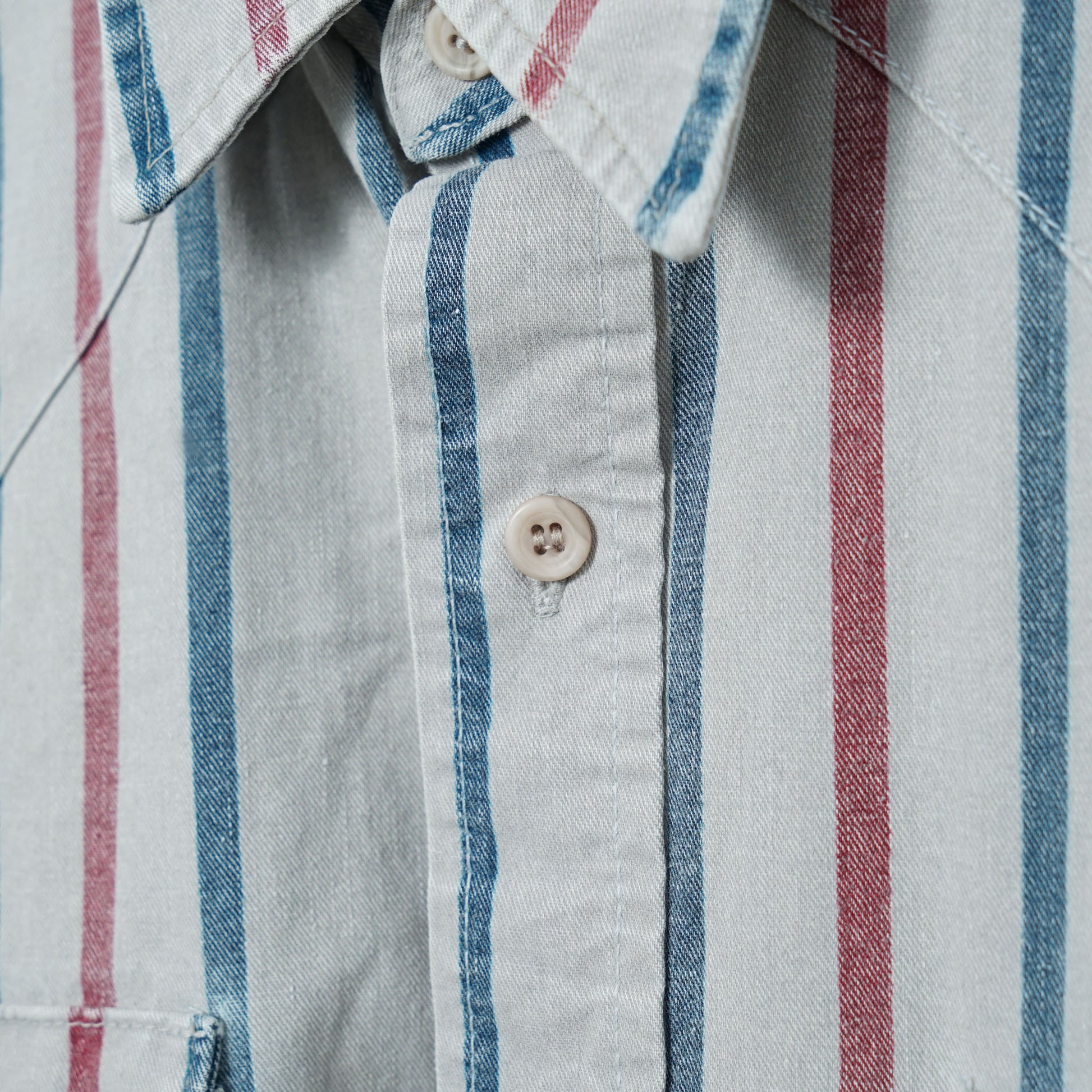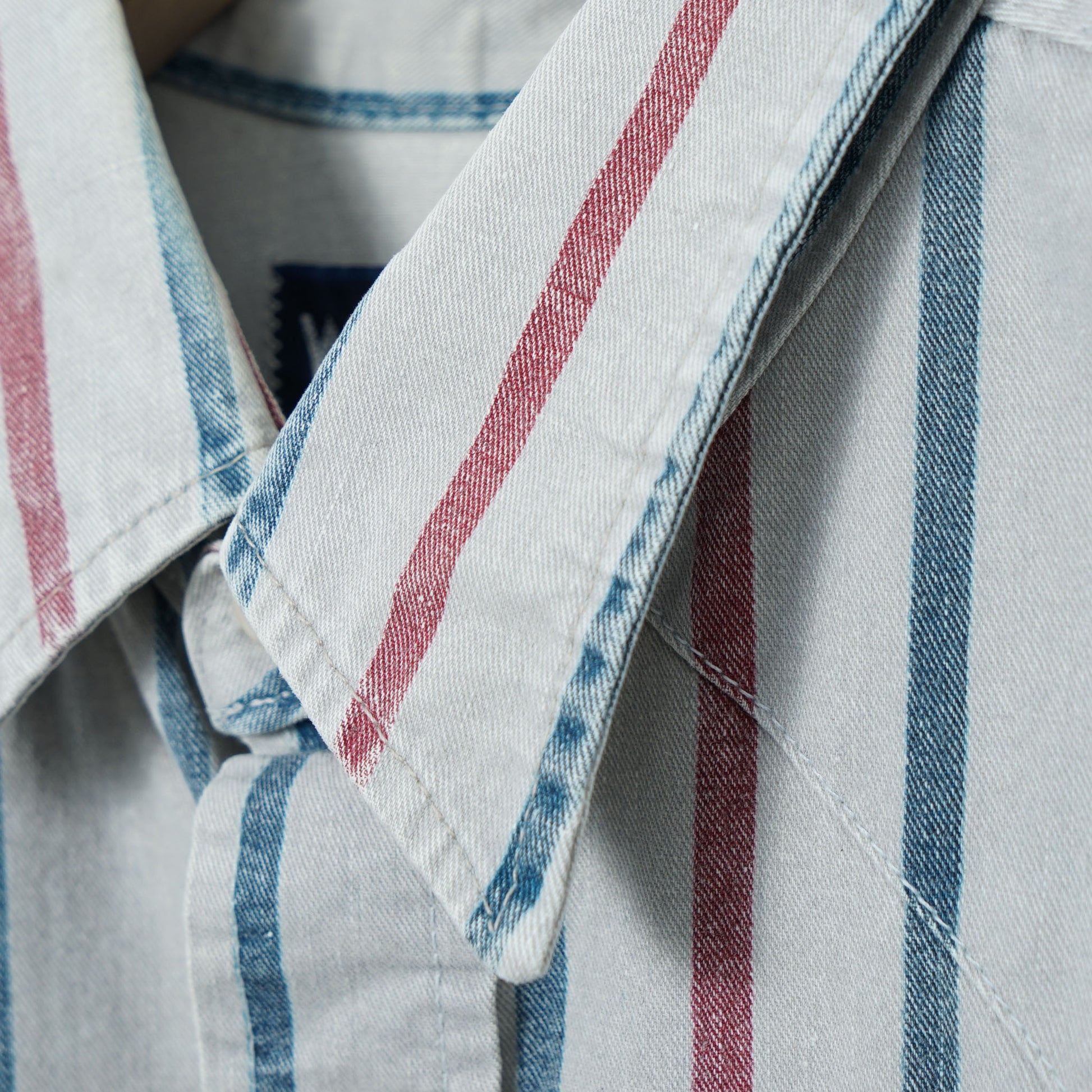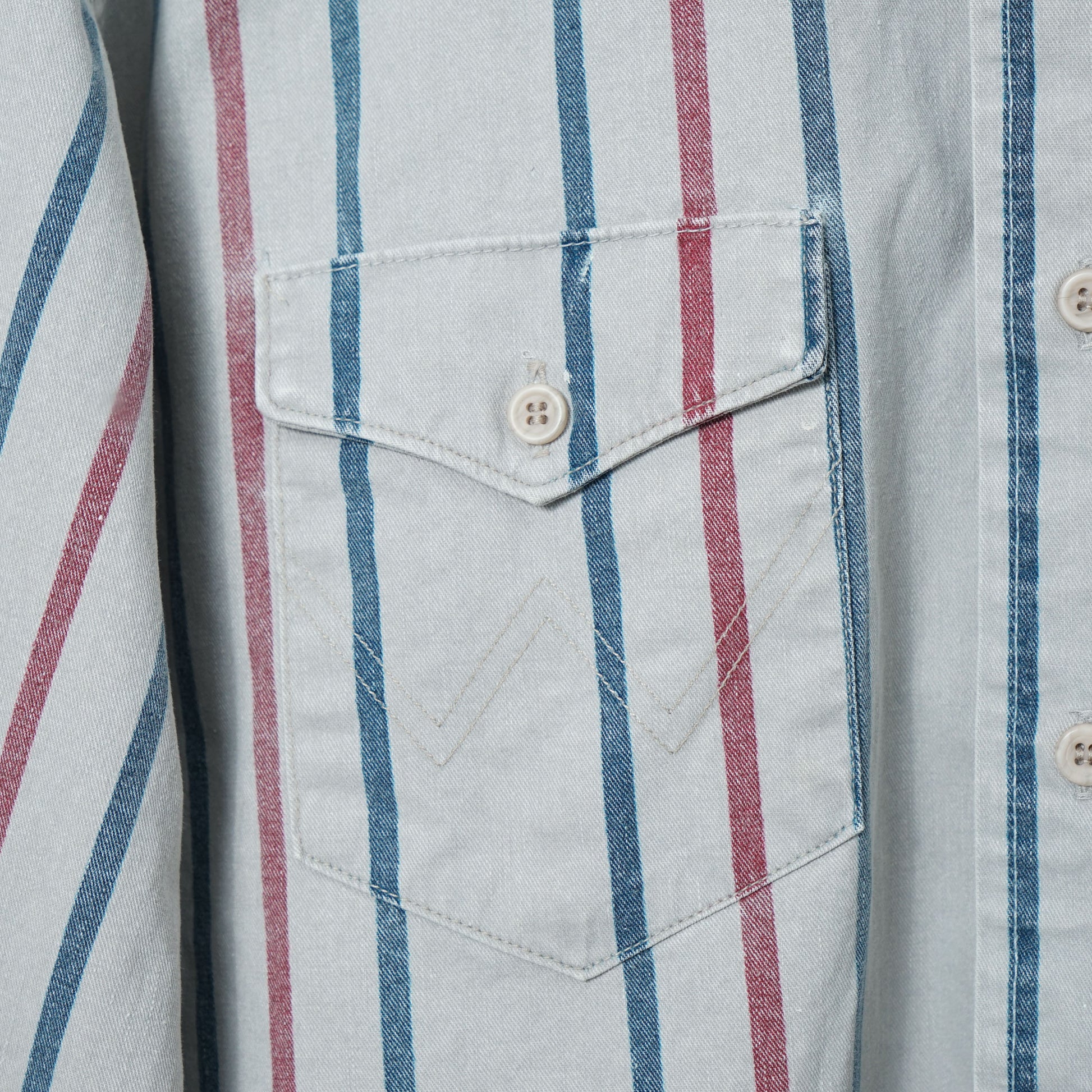 Wranglerのストライプ・ウエスタンシャツ。ライトグレーをベースに、ブルーとレッドの縦ラインが入る端正な一枚です。
